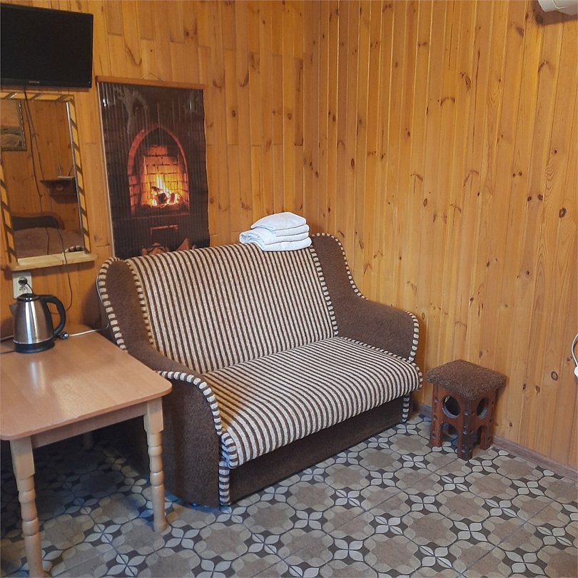 Однокомнатный номер оснащен сан. узлом телевизором, кондиционером, чайником, холодильником, двух-спальной кроватью и полуторо-спальным диваном, расположен над крытым бассейном, а так же имеет выход к детскому бассейну. Вместимость до 4-х человек.Услуги и удобства