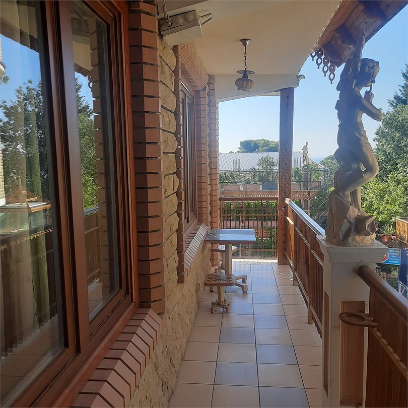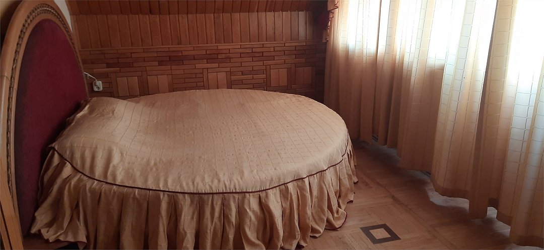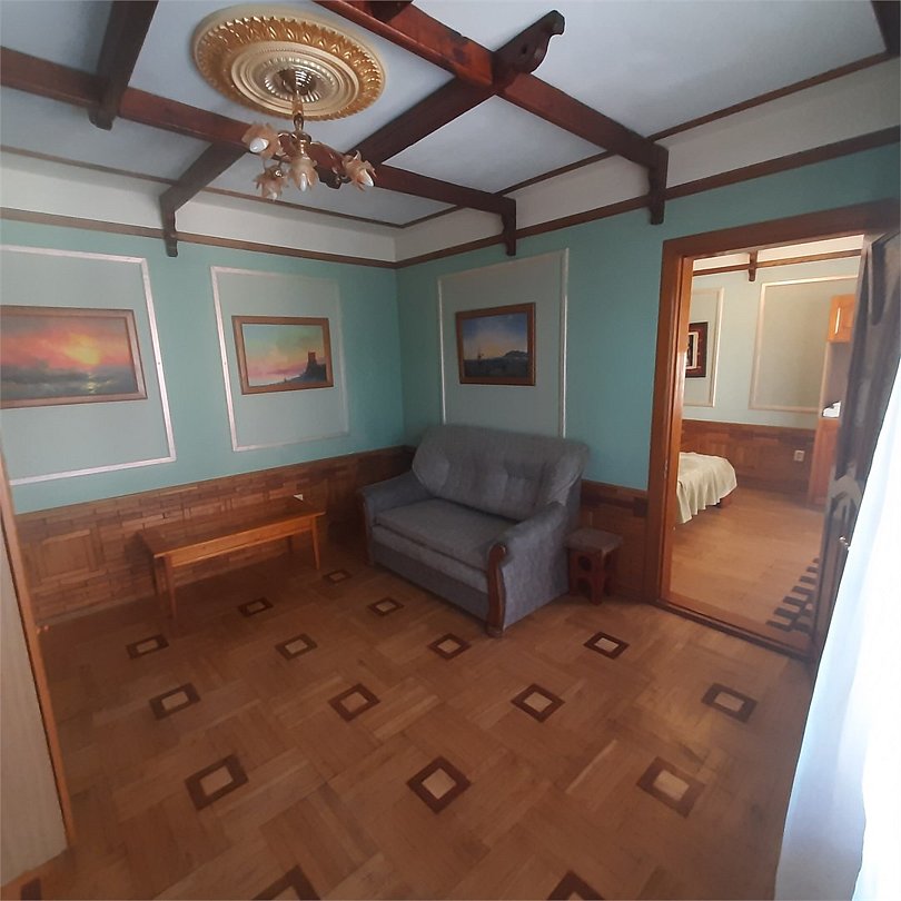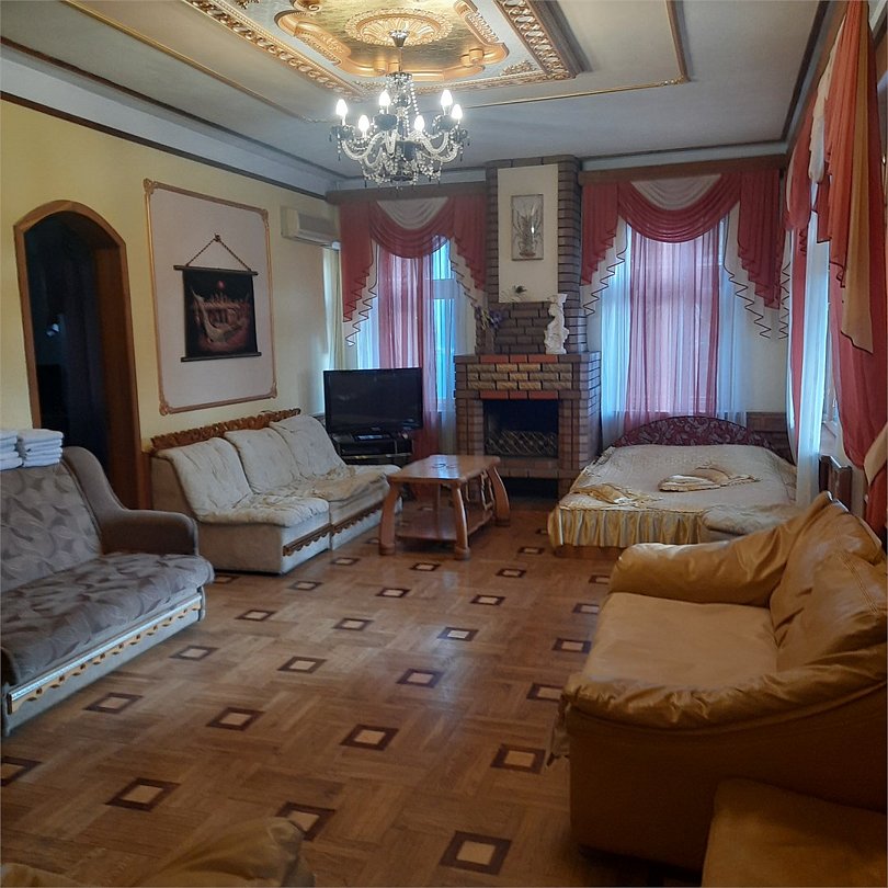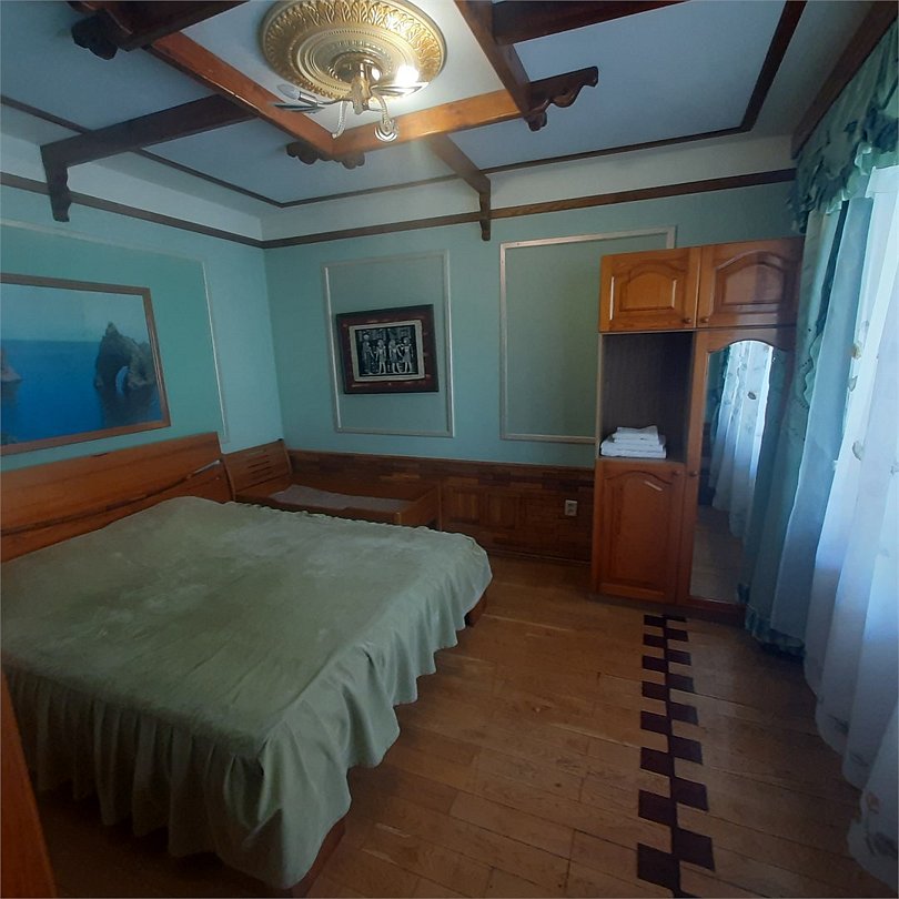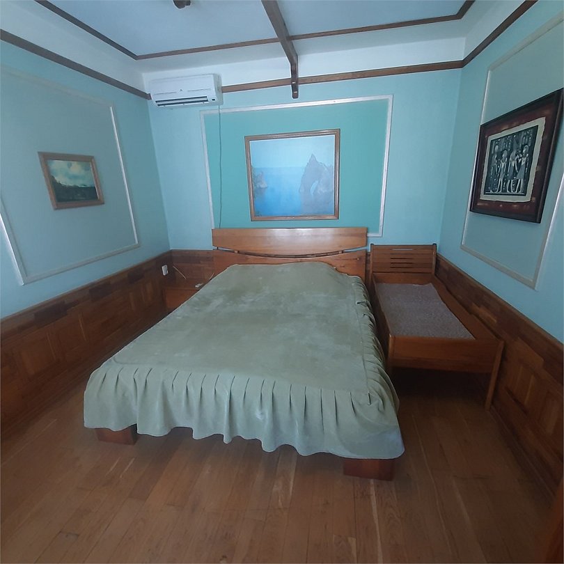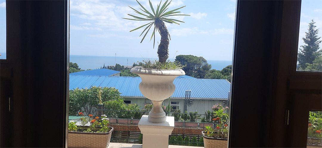 Трех-комнатный номер, в каждой комнате установлен кондиционер, телевизор, в одной из комнат камин, центральное отопление, сан.узел, холодильник микроволновая печь, чайник, сейф, большой круглый обеденный стол. Над номером расположен зимний сад с бильярдом и летний сад с беседкой тенисным столом и видом на море. Вместимость до 9-ти человек. Удобен для большой компании или нескольких семей.Услуги и удобства