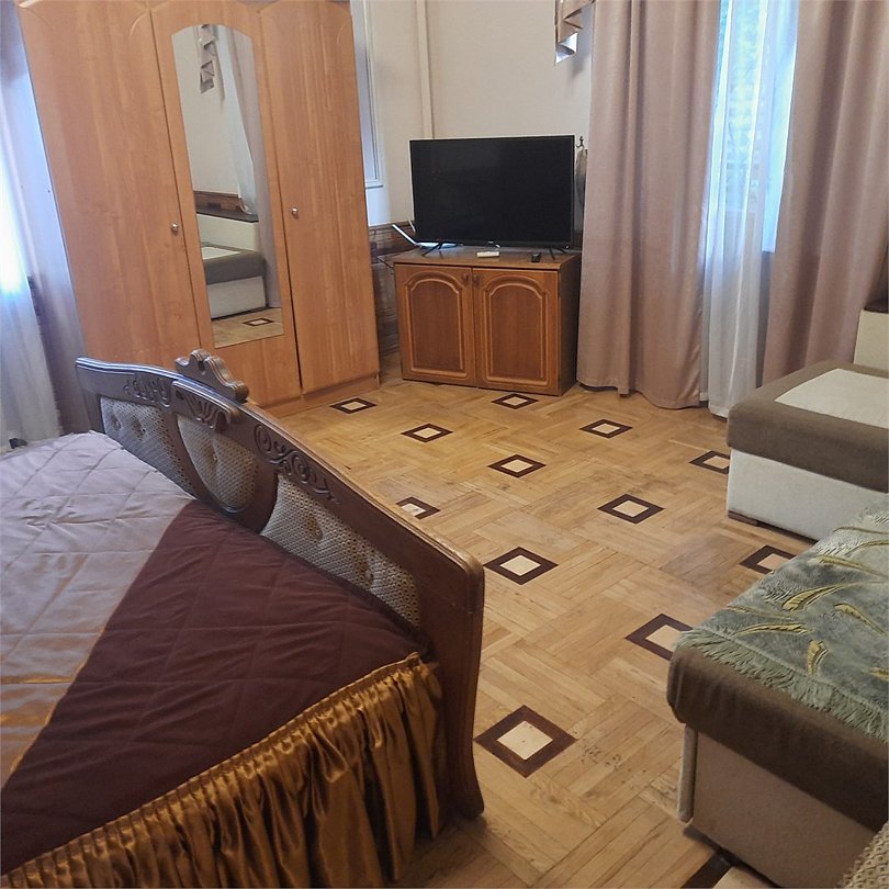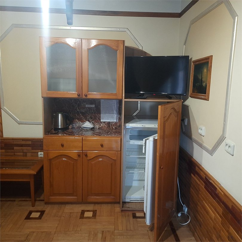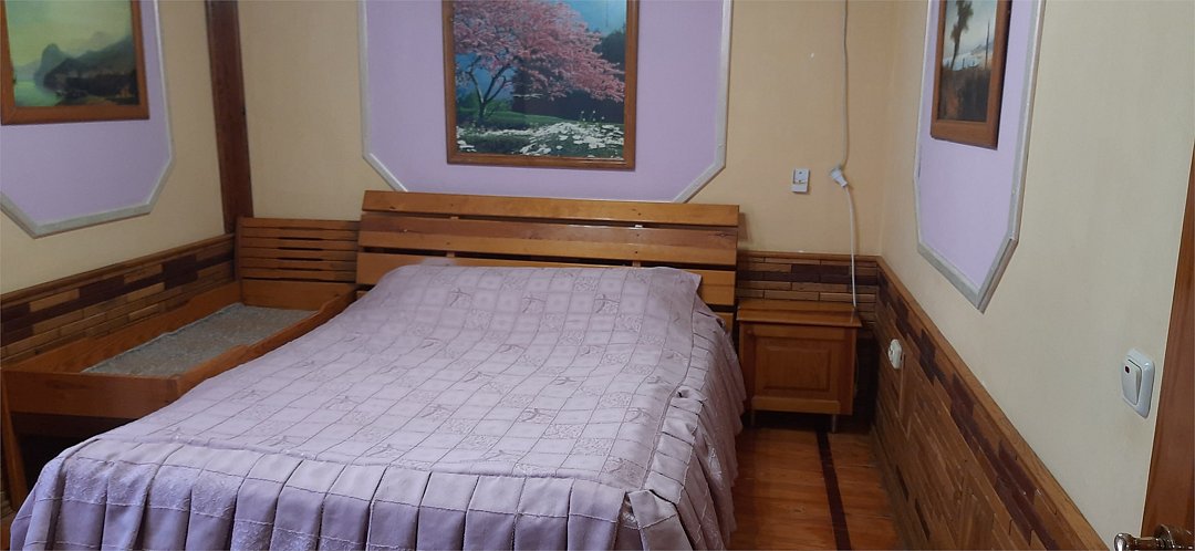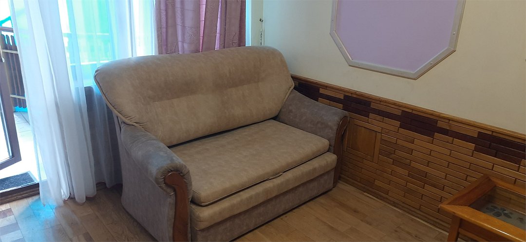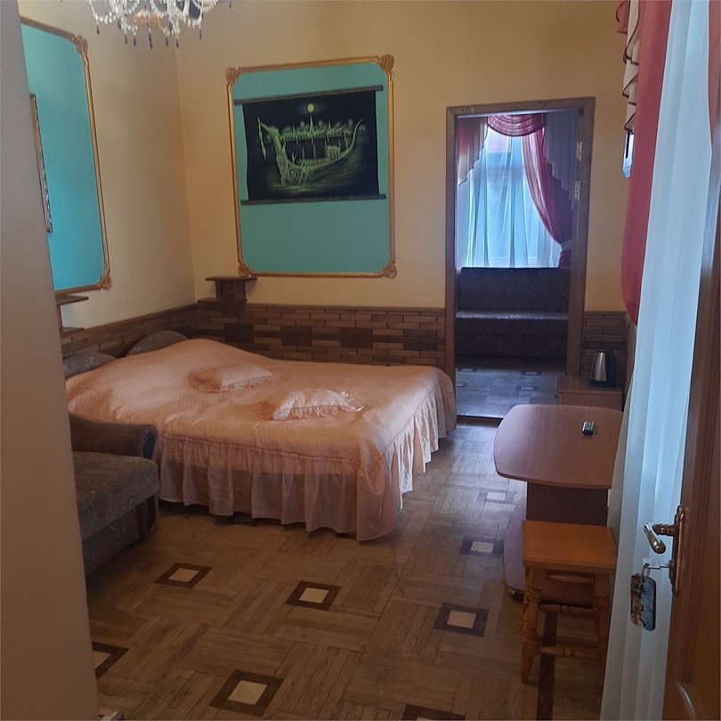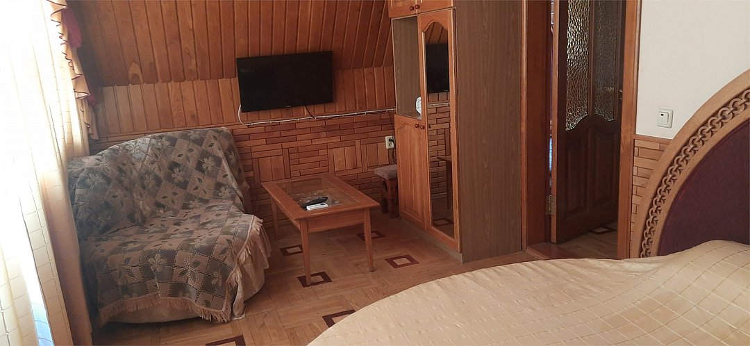 Двухкомнатный номер оснащен сан. узлом телевизором, кондиционером, чайником, холодильником, двух-спальной кроватью и полуторо-спальным диваном. Есть детская кровать для детей до 5-ти лет. Имеет балкон выходящий во двор. Вместимость до 4-х человек.Услуги и удобства