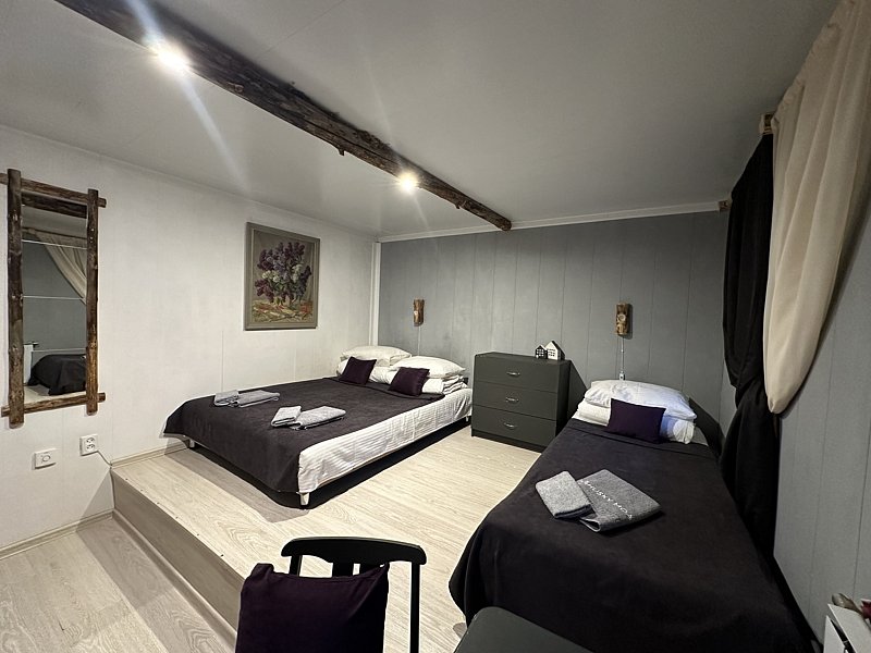 Просторный четырехместный номер на 1 этаже с одной двуспальной и двумя раздельными односпальными кроватями. В номере подключен телевизор.