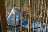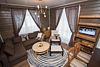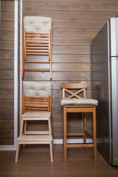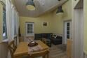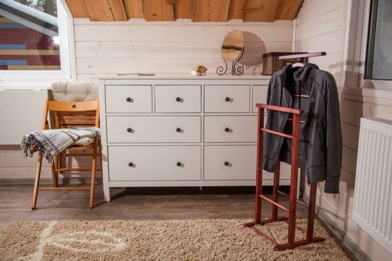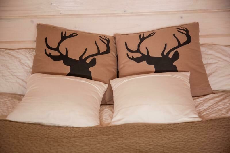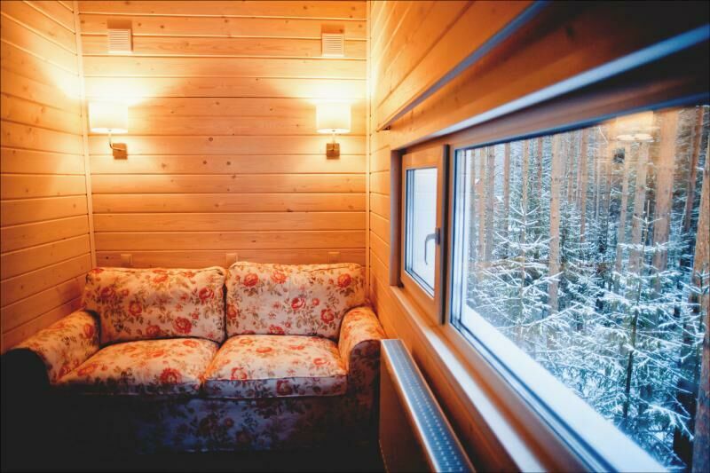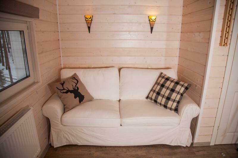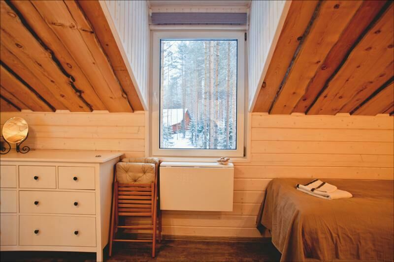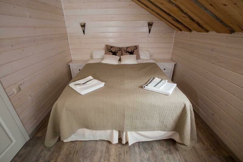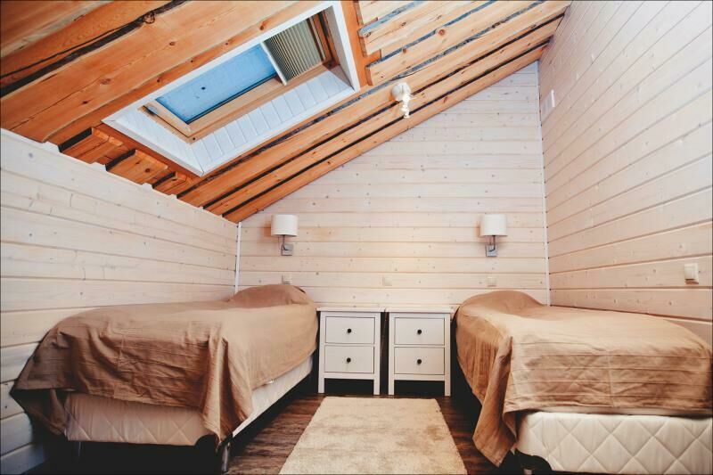 На втором этаже расположены две комфортабельные комнаты. В каждой из них предусмотрена большая двуспальная кровать, которую, при желании гостей, легко можно трансформировать в две односпальные. У окна располагается удобный диван, который так же трансформируется в двуспальную кровать. Ночью через мансардные окна можно наблюдать звездное небо.