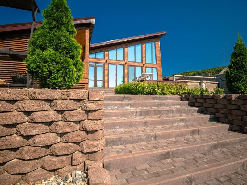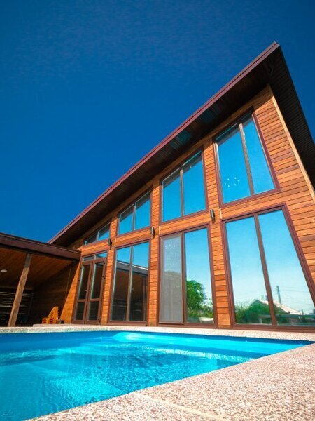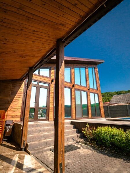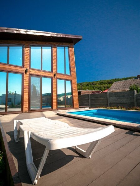 Техника, баня в коттедже, огромная терраса, большая ухоженная территория, бассейн с лежаками на территории дома.