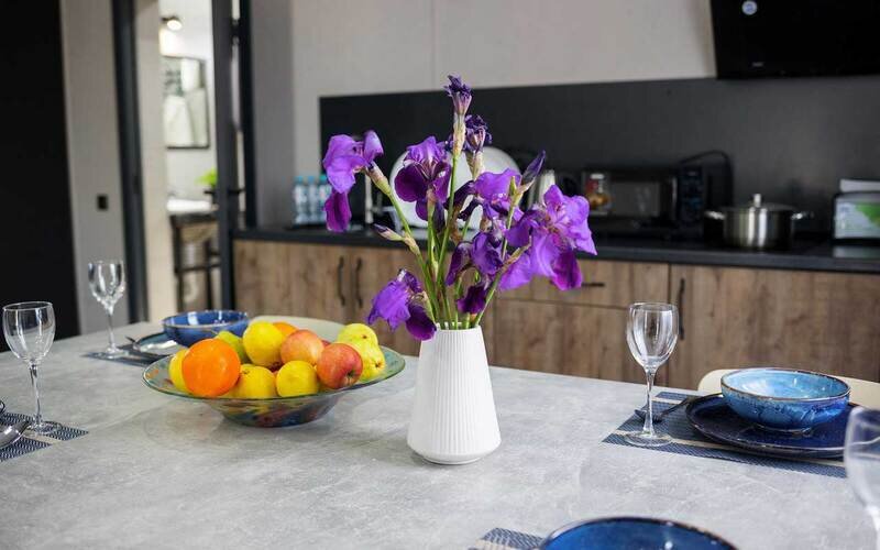 Индивидуальный бассейн с подогревом (круглогодично), Телевизор с плоским экраном,Wi-Fi, телефон, Сплит-система, фен, прикроватные светильники, холодильник , утюг и гладильная доска. 2 Двуспальные кровати, 2 односпальные кровати, багажная тумба, зеркало, диван, шкафы для одежды, письменный стол и стул, вешалки Душ, санузел, раковина, унитаз, зеркало с подсветкой, зубная щетка, зубная паста, шампунь, мыло, гель для душа, лосьон для тела, салфетки, туалетная бумага, халаты, банные полотенца, тапочки, шапочка банная Кухонная мебель, тарелки, нож, ложки, вилки, микроволновая печь, индукционная печь на 2 конфорки, Информационная карта, меню, обслуживание номеров, сейф, чайник, чайный набор, письменные принадлежности, мини-бар в соответствии с ассортиментом (чай, кофе, сахар, вода), косметическое зеркало, стаканы, отопление- теплые полы, швейный набор, ключ для открывания бутылок, губка для обуви, рожок для обувиУслуги и удобства