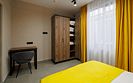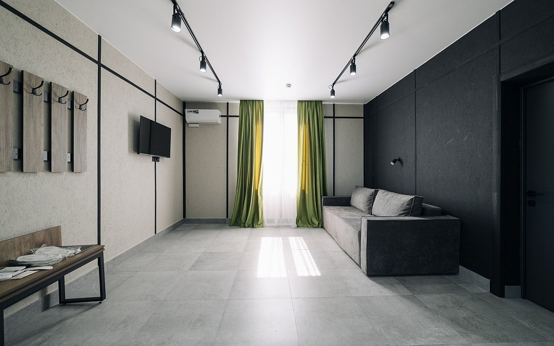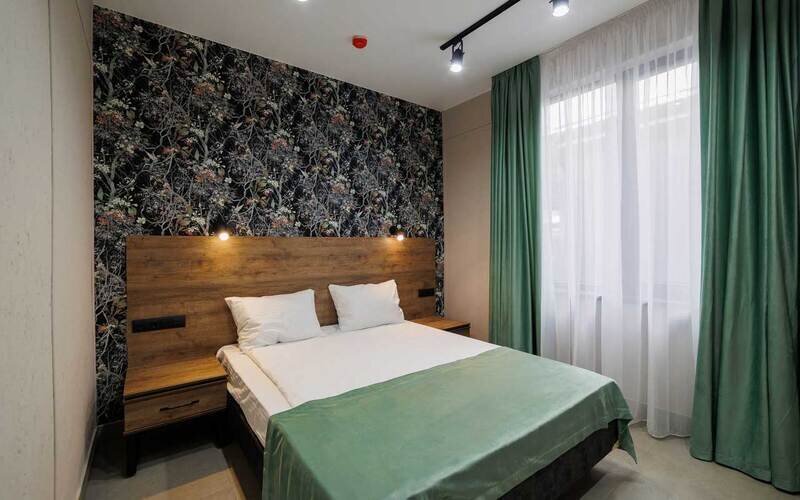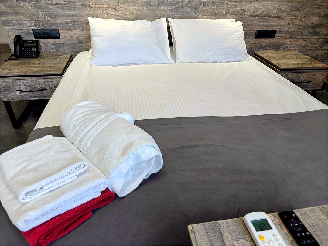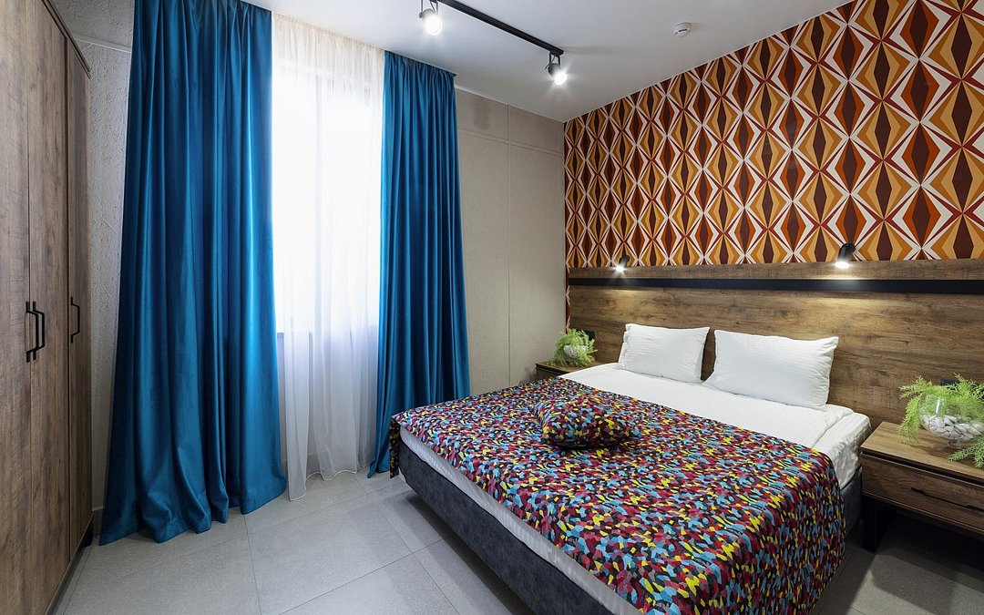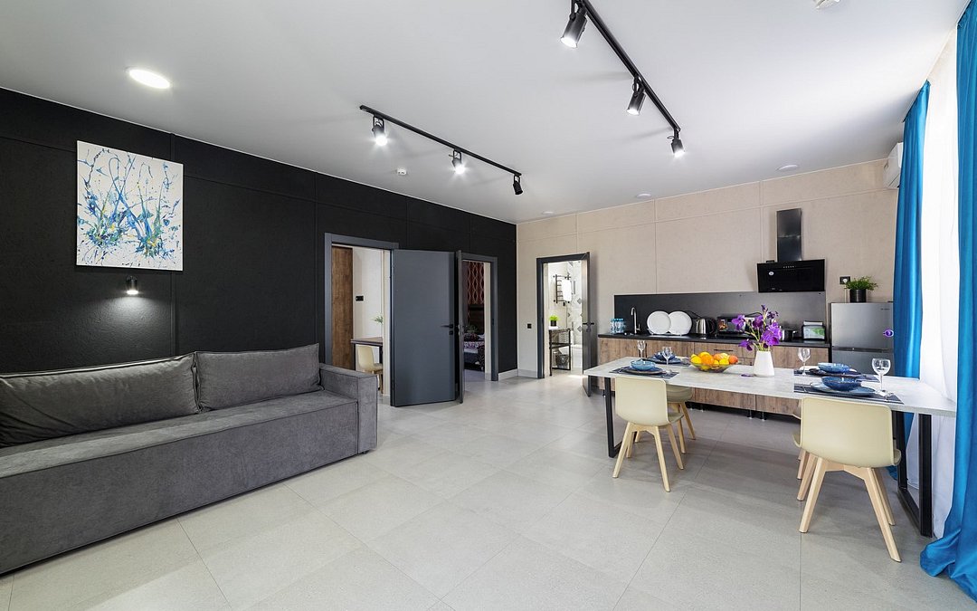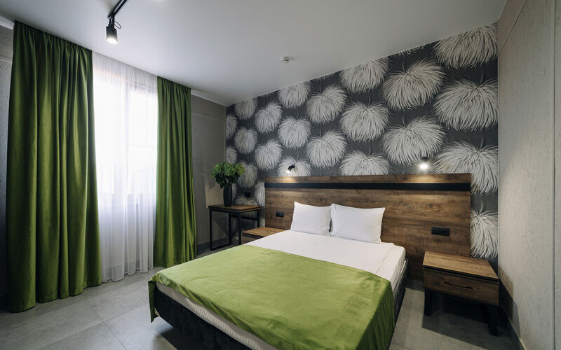 Телевизор с плоским экраном,Wi-Fi, телефон, Сплит-система, фен, прикроватные светильники, холодильник , (утюг и гладильная доска по требованию). Двуспальная кровать, кресло-кровать, багажная тумба, зеркало, шкаф для одежды, письменный стол и стул, вешалки Душ, санузел, раковина, унитаз, зеркало с подсветкой, зубная щетка (в день заезда), зубная паста (в день заезда), шампунь, мыло, гель для душа, лосьон для тела, салфетки, туалетная бумага, халаты, банные полотенца, тапочки, шапочка банная. Информационная карта, меню, обслуживание номеров, сейф, чайник, чайный набор, письменные принадлежности, мини-бар в соответствии с ассортиментом (чай, кофе, сахар, вода), косметическое зеркало, стаканы, отопление- теплые полы, швейный набор, ключ для открывания бутылок, губка для обуви, рожок для обувиУслуги и удобства