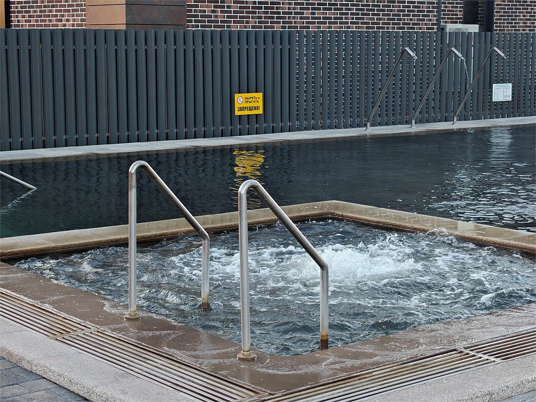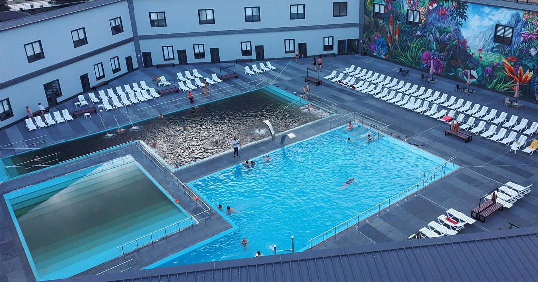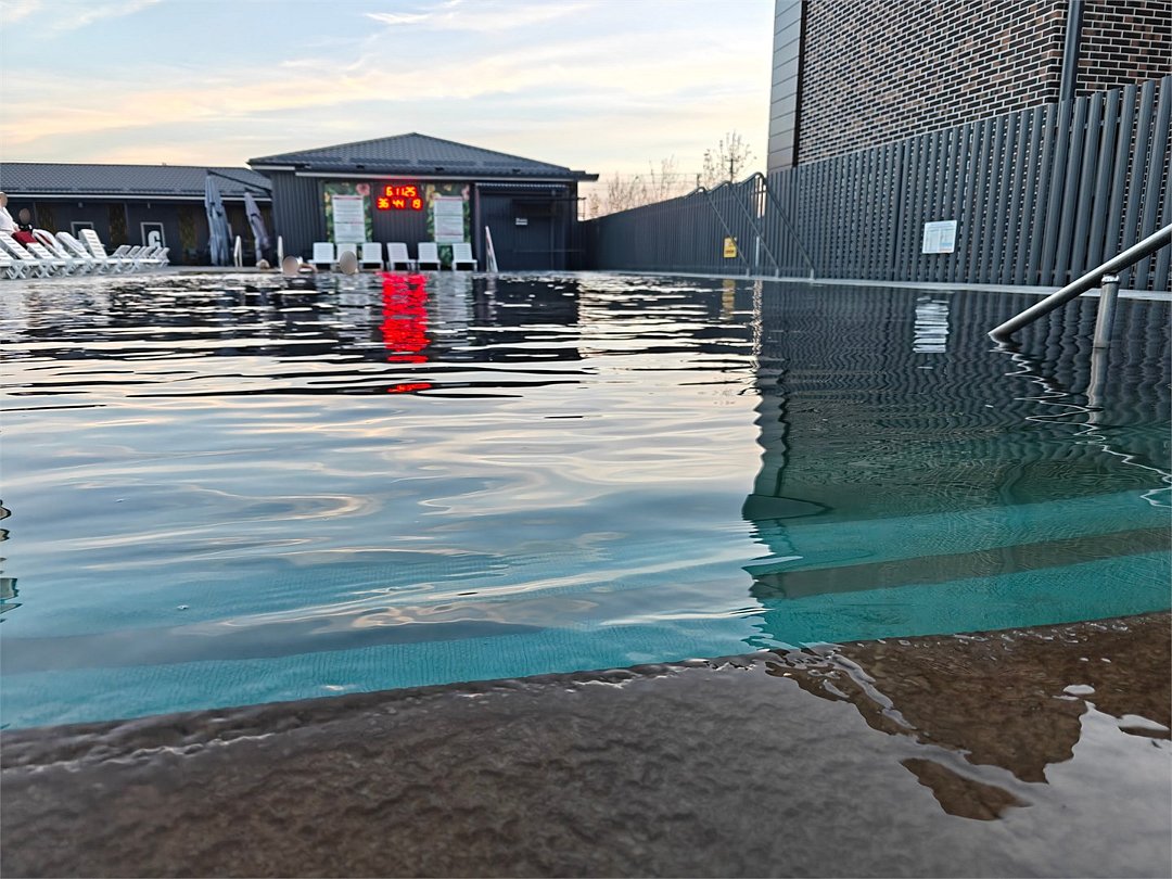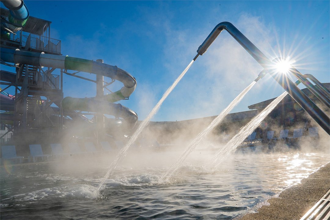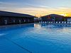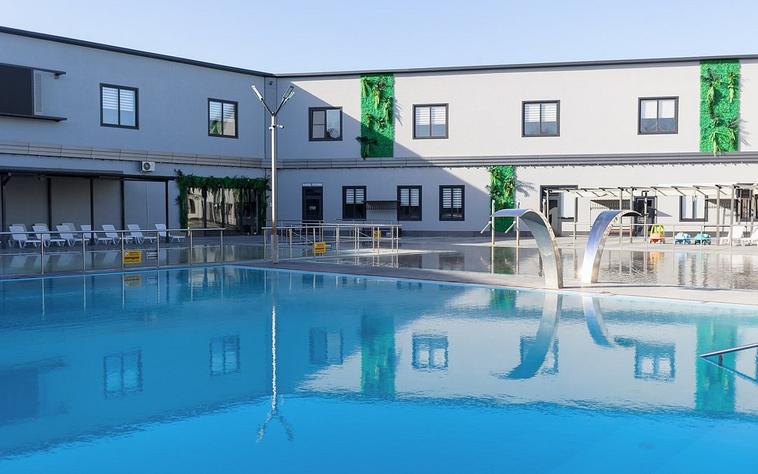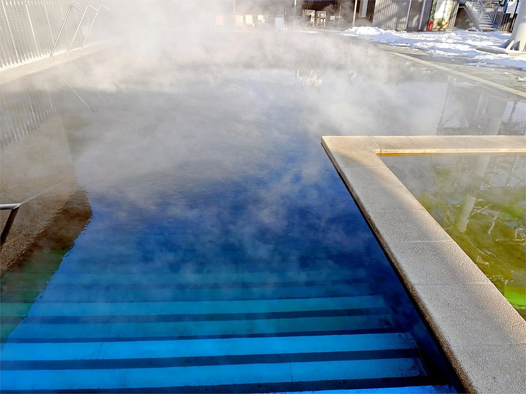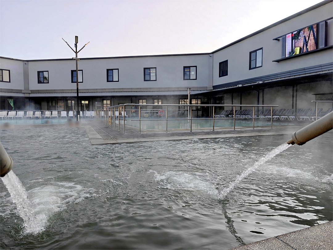 - Бассейны с теплой водой (два с термальной и один с пресной водой) под открытым небом общей площадью 700 кв. м (два взрослых и один детский) с противотоками, с гидромассажными и аэромассажными группами, с 8 водопадами, с оборудованной зоной отдыха и релакса, с системой видео- и аудиотрансляцией, лежаками, крытыми местами для отдыха
