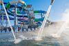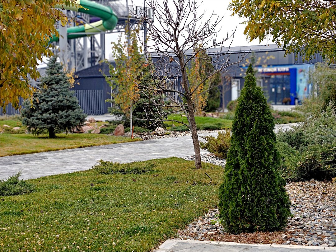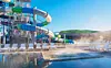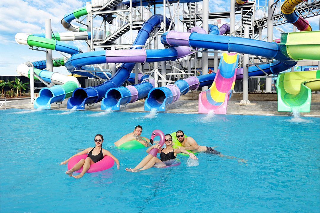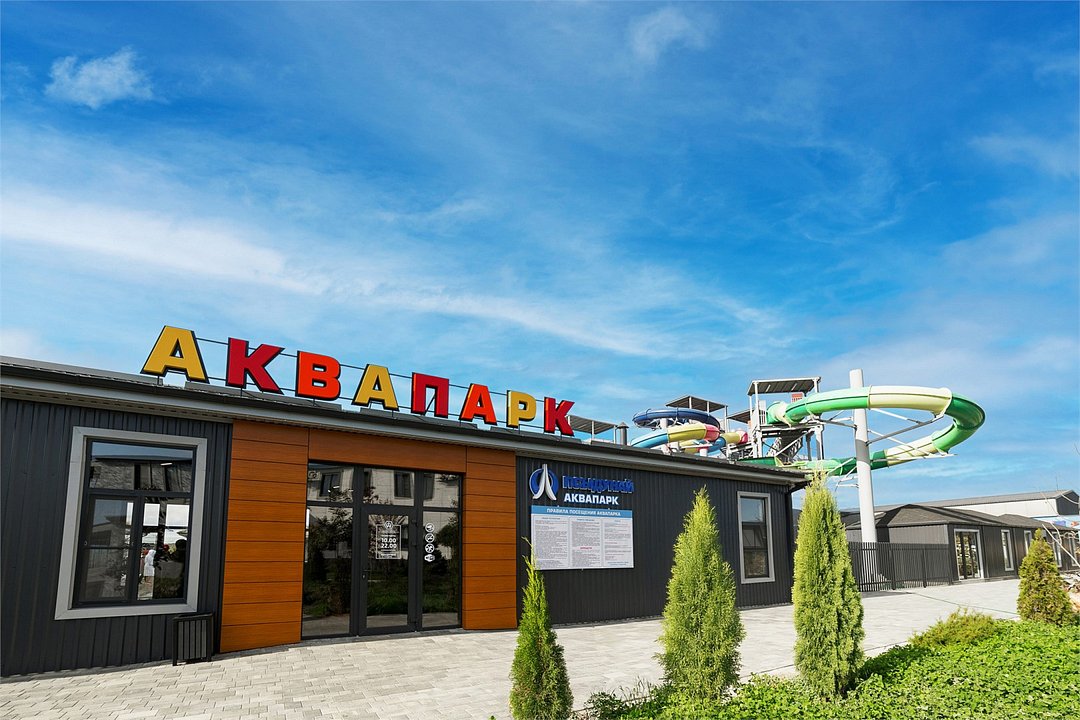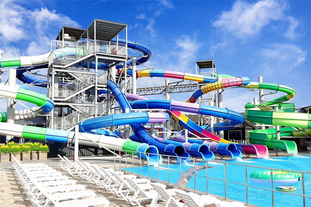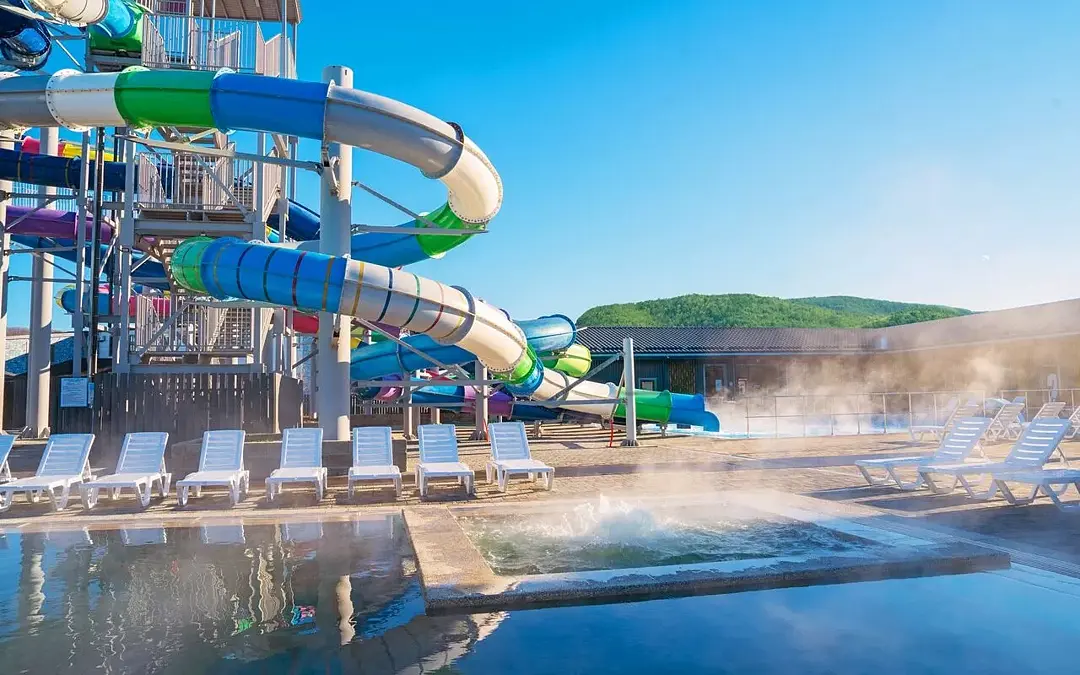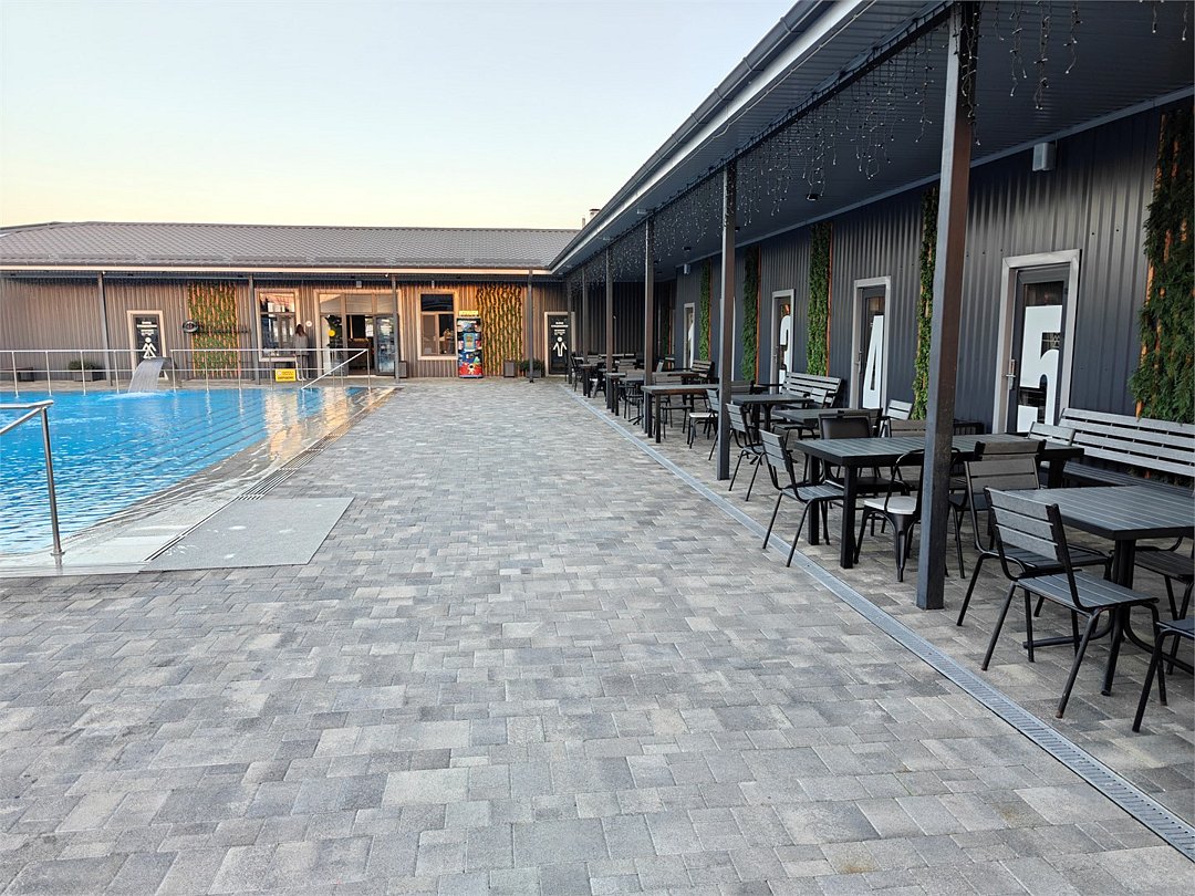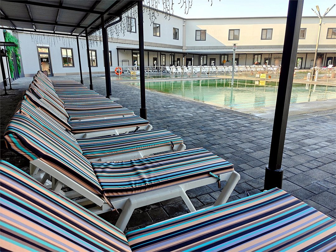- Бассейны с теплой водой (два с термальной и один с пресной водой) под открытым небом общей площадью 700 кв. м (два взрослых и один детский) с противотоками, с гидромассажными и аэромассажными группами, с 8 водопадами, с оборудованной зоной отдыха и релакса, с системой видео- и аудиотрансляцией, лежаками, крытыми местами для отдыха