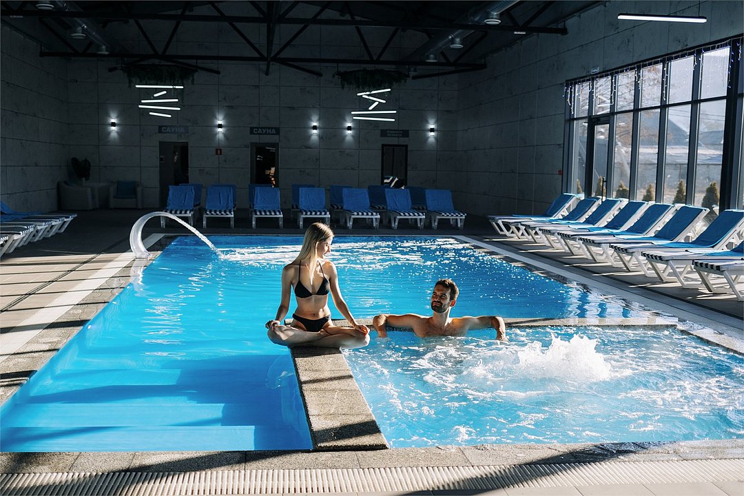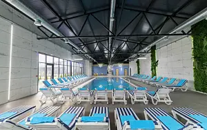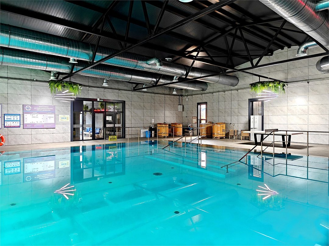 Читать полностьюКрытый бассейн с двумя чашами: с пресной и термальной водой с гидромассажными и аэромассажными группами.