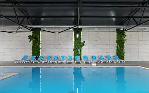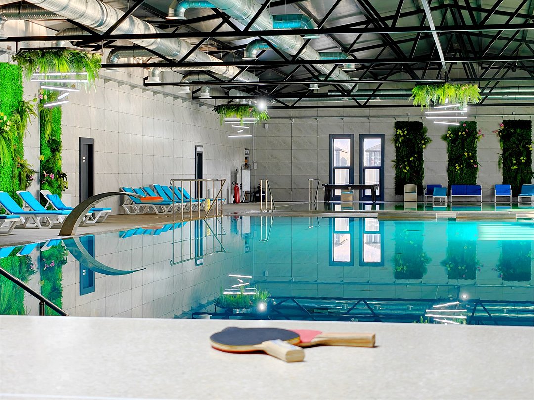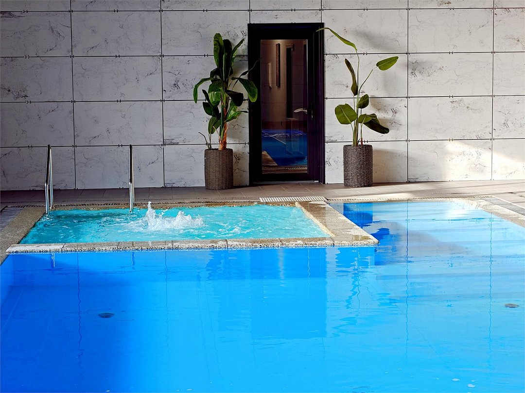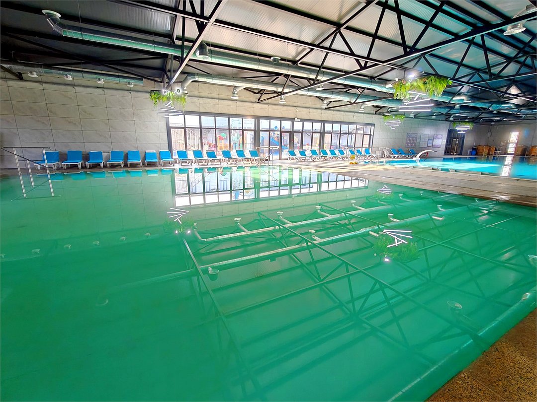 Специальная автоматическая система охлаждает термальную воду (32°–37°), а пресную воду нагревает перед подачей в бассейны (28°–35°) в зависимости от погоды на улице.Крытый бассейн