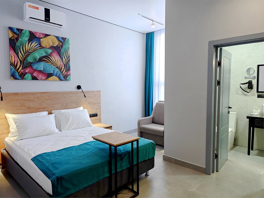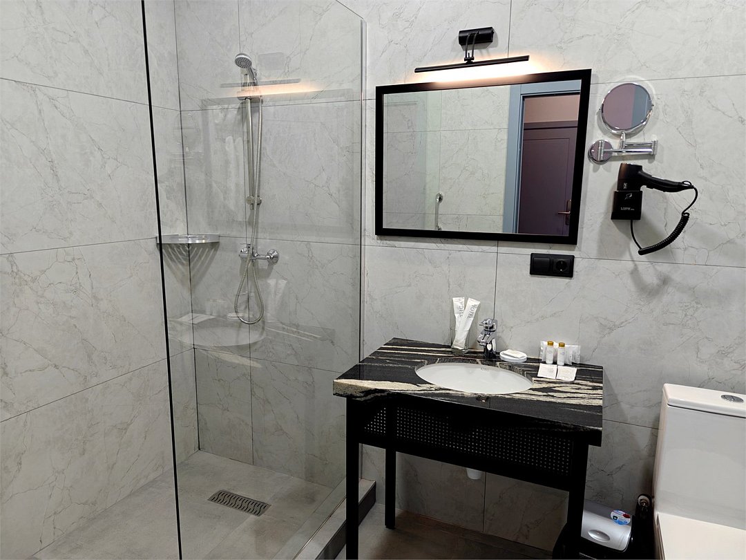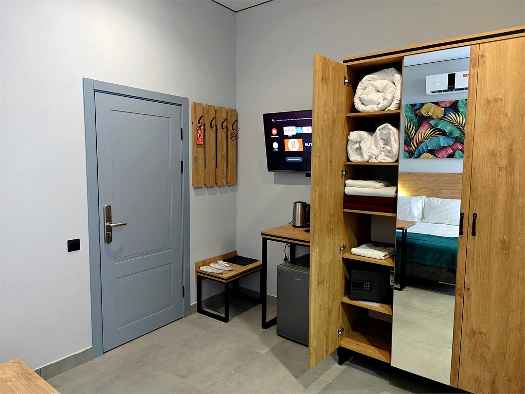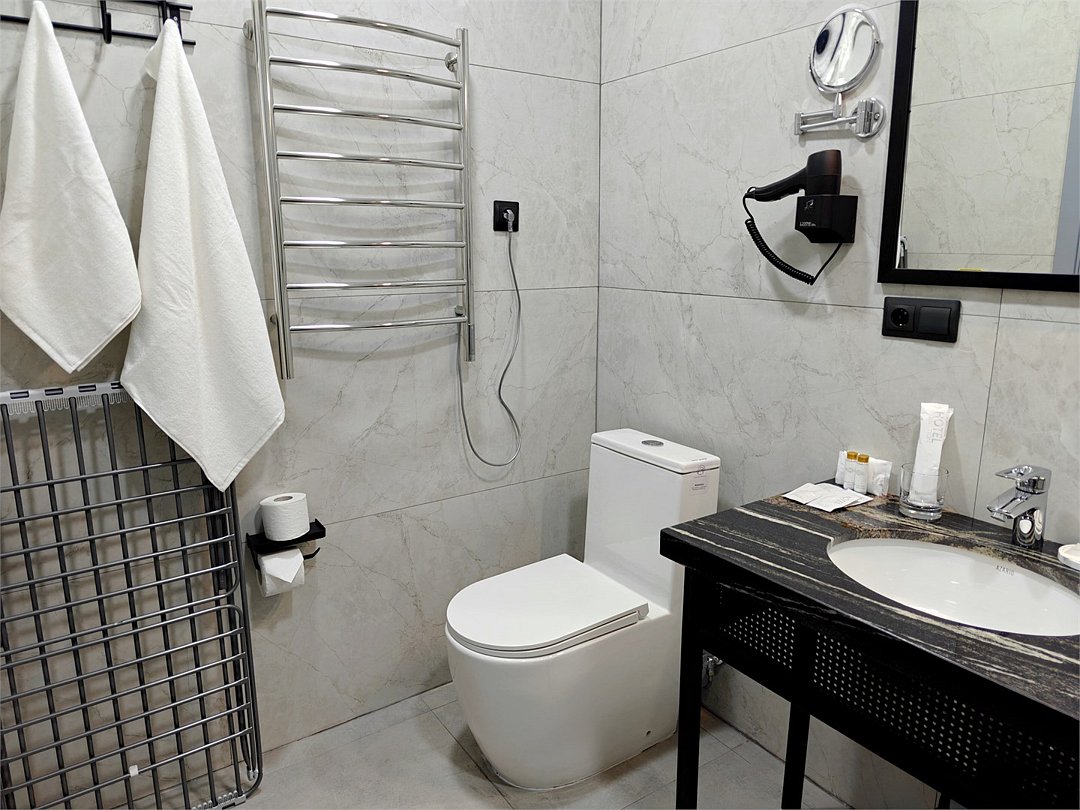 Wi-Fi, телефон, холодильник, светильник, фен, электронные замки, ванная комната, душевая кабина, теплый пол, халаты, банные полотенца, пляжные полотенца, тапочки, косметические средства, двуспальная кровать, стулья, шкаф для одежды, вешалки, письменный стол, багажная тумба, зеркало, письменные принадлежности, чайный набор, информационная карта, меню, сейф, чайник, унитаз, раковина, косметическое зеркало, плиточное покрытие, вид во двор, высокие потолки, стаканы, тумба, туалетные средства, сплит-система, мангал, телевизор со Smart TV, теплые полы, общественный бассейн, фитнес-зона, кресло-кровать, услуги прачечной (платно), вешалки-плечики, бутилированная вода, СПА, шапочка для душаВ гостиничном номере
