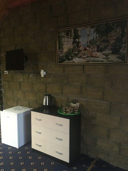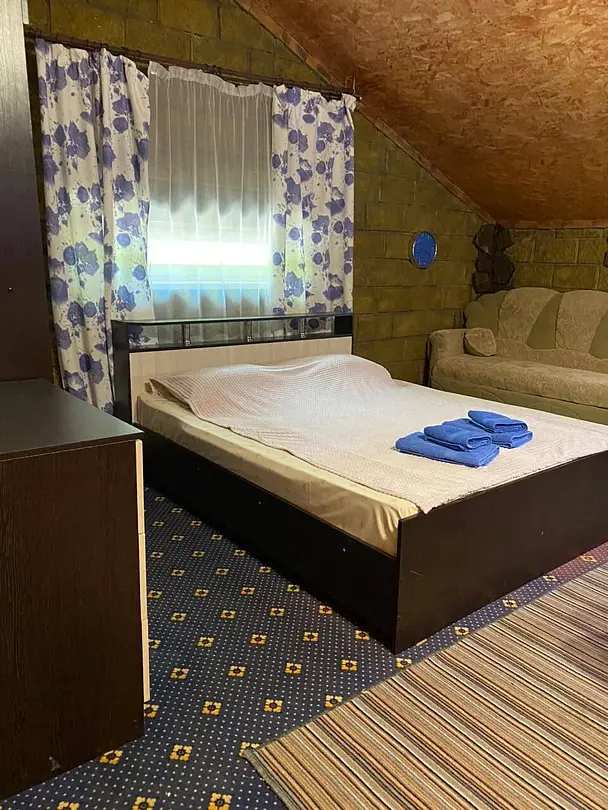 Интерьер номера выполнен в "древесных тонах", где имеется большая двуспальная кровать king-size, шкаф для одежды и 2 тумбочки для удобства каждого гостя, а так же телевизор с плоским экраном, компактный холодильник, чайник. В душевой комнате для удобства наших гостей имеются туалетные принадлежности, освежитель воздуха и комплект полотенец на каждого гостя.