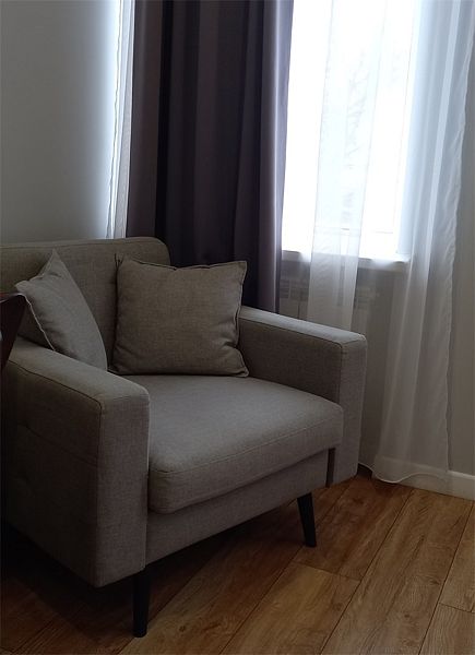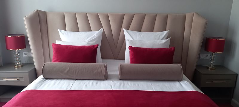 Стандартные номера очень маленькие - 90% комнаты занимает кровать. А вот полу-люкс, который был у меня, мне понравился. Две комнаты: гостиная и спальня. В гостиной стильный диван, стол с чайным уголком, шкаф (с сейфом), холодильник. В спальне - кровать, кресло, тумбочка, телевизор.
