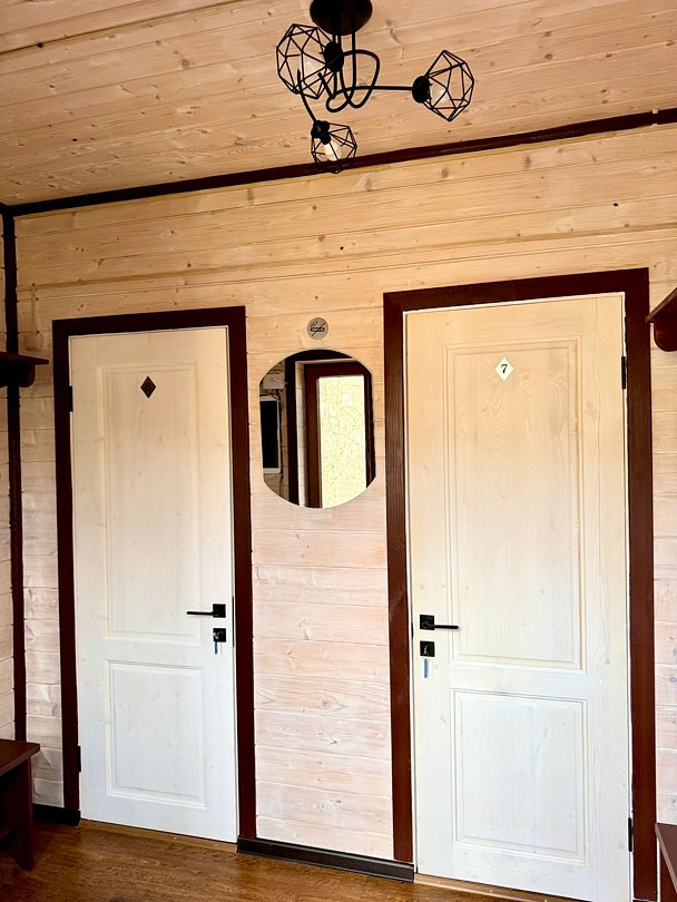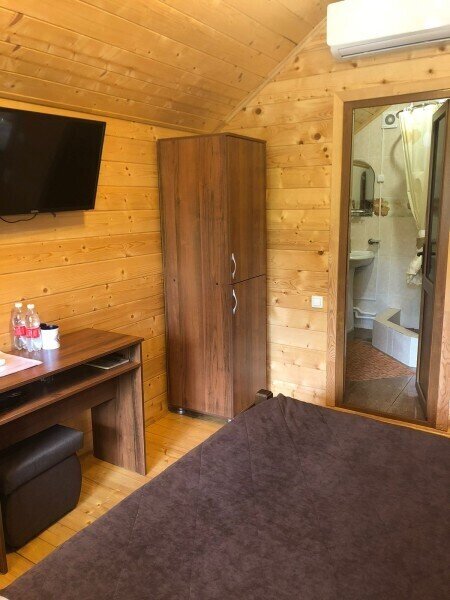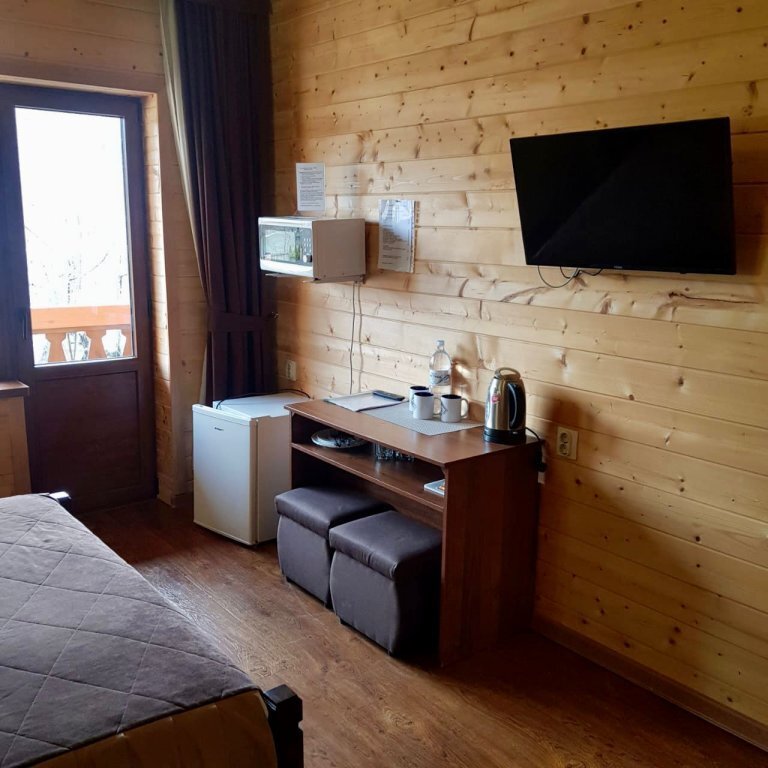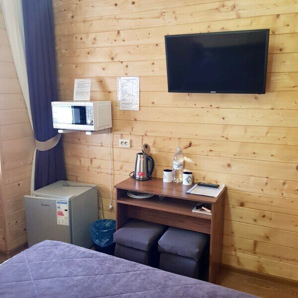 В номерах имеется: двуспальная кровать, двуспальный диван, раскладное кресло, прикроватные тумбочки, стол, стулья, шкаф, вешалки для одежды, отдельный санузел (душ, раковина, унитаз, фен, шампунь, мыло, гель для душа), сушилка для белья, кондиционер, СВЧ, чайник, посуда, холодильник, телевизор, балкон со столом и лавкой. Вид на реку и горы.