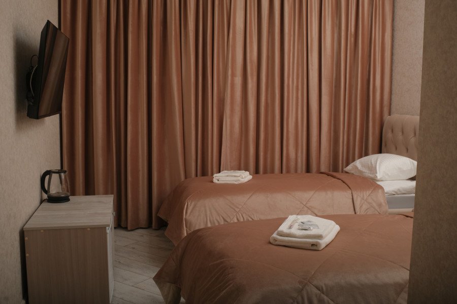 Двухместный номер с двумя полуторными кроватями. Оснащён ТВ, феном, современным сан.узлом.