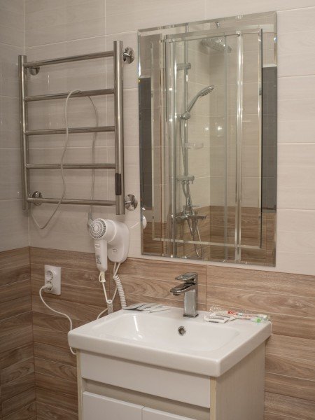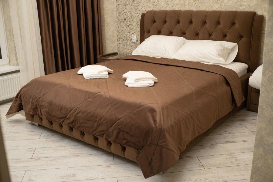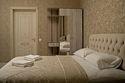 Двухместный номер с двуспальной кроватью и дополнительным спальным местом (кресло-кровать). Номер оснащён телевизором, холодильником, феном, современным сан.узлом. В ванной комнате личные принадлежности - тапочки, халат, полотенца, шампуни.