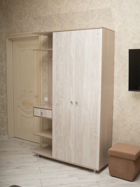 Двуспальная кровать, тумбочки, шкаф, санузел, ТВ, фен, холодильник, тапочки, халат, полотенца, шампуни