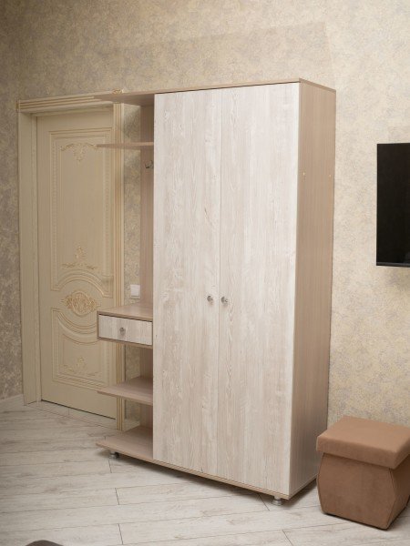 Двуспальная кровать+раскладное кресло-кровать, тумбочки, шкаф, санузел, ТВ, фен, холодильник, тапочки, халат, полотенца, шампуни