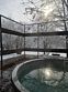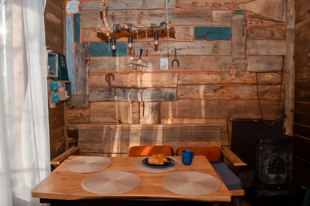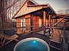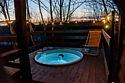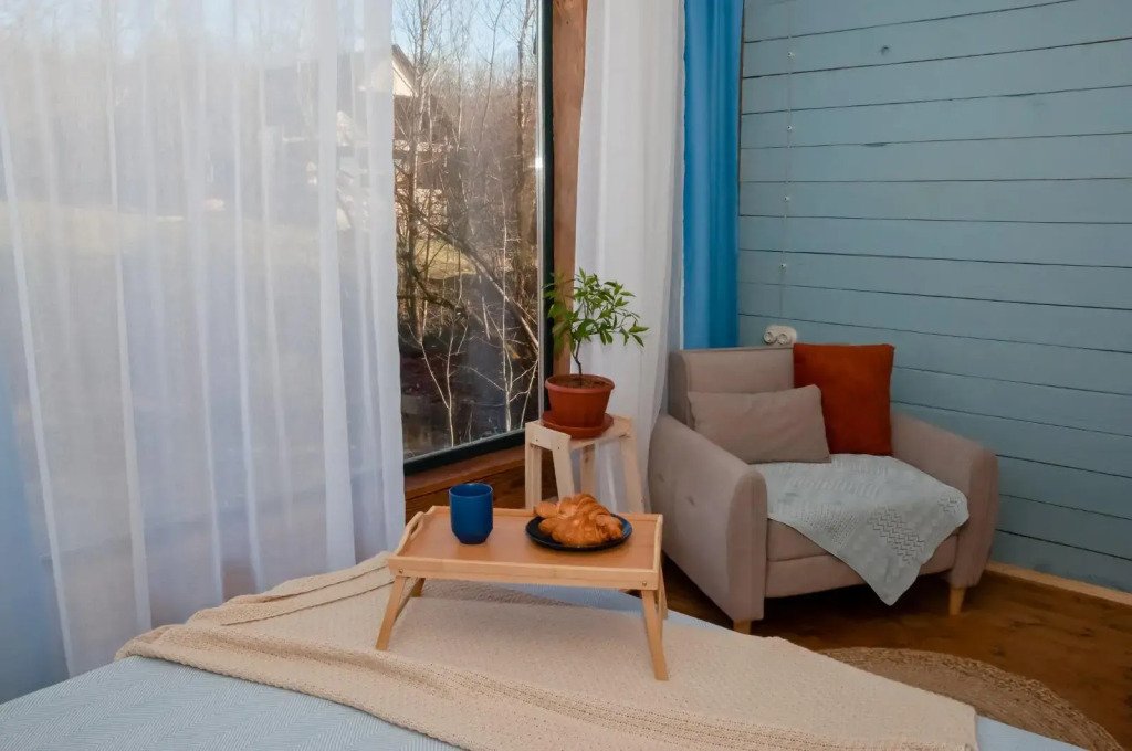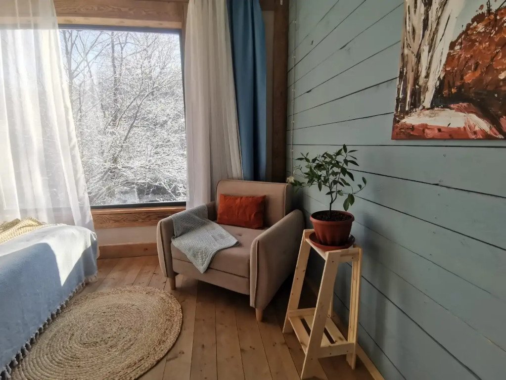 Круглосуточно доступна горячая купель 38°С с гидромассажем и подсветкой. В глэмпинге панорамные окна, есть каминная печь и сатиновое постельное бельё.