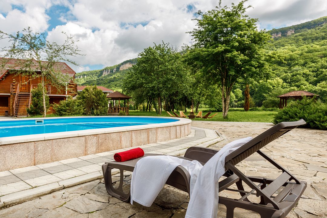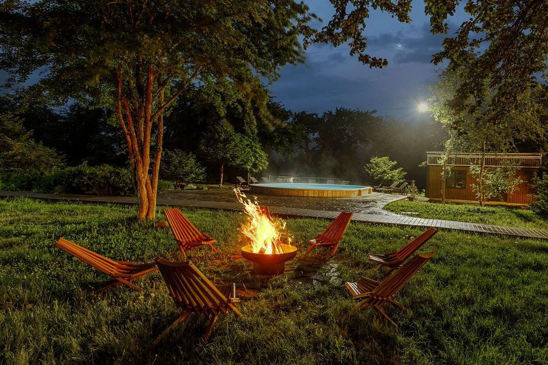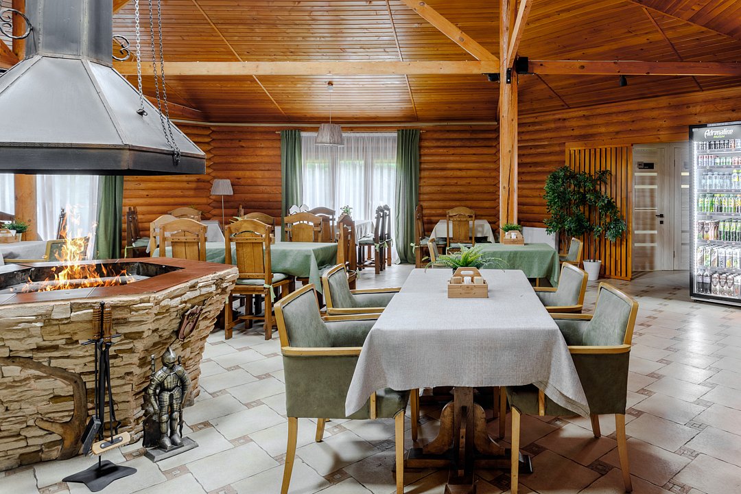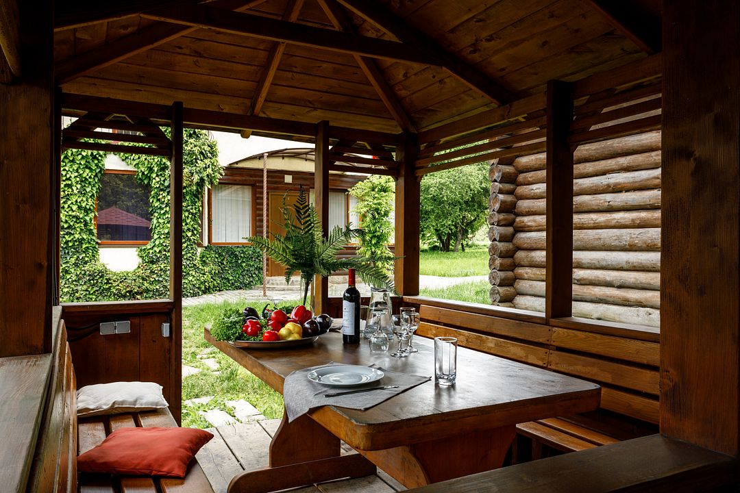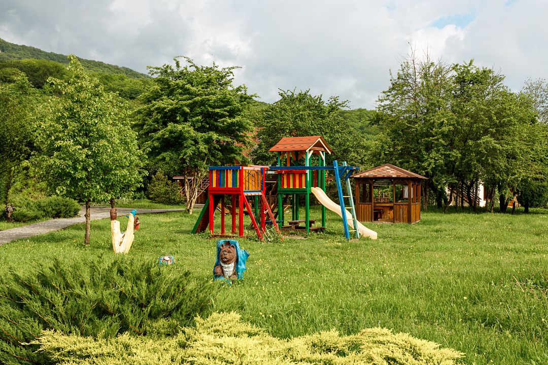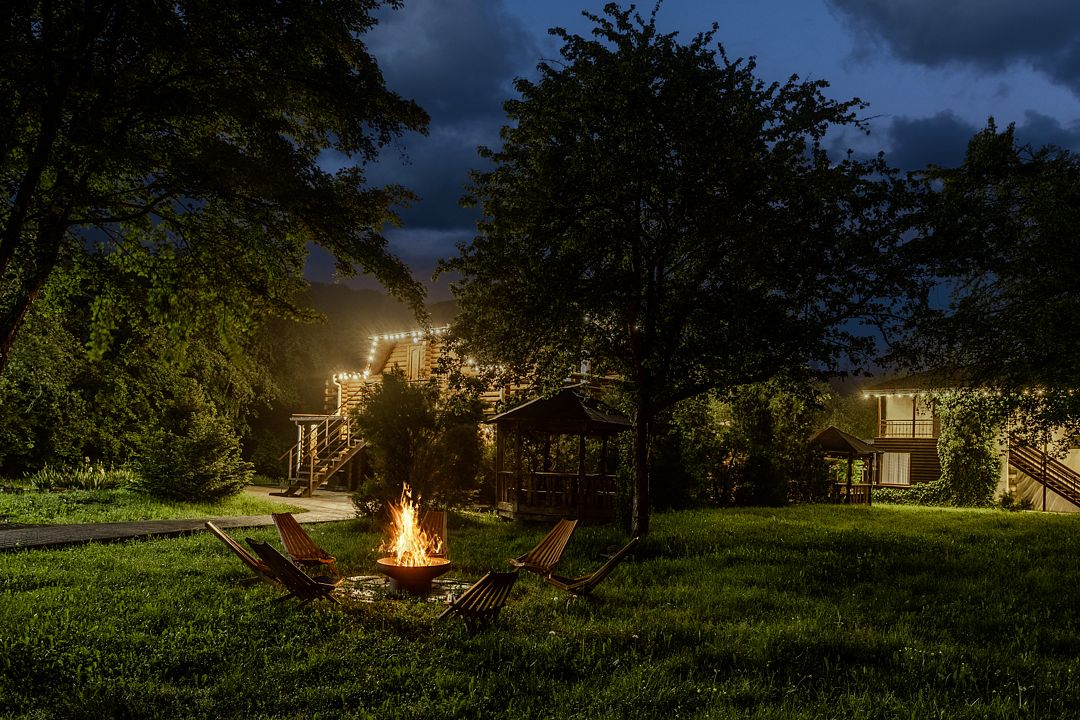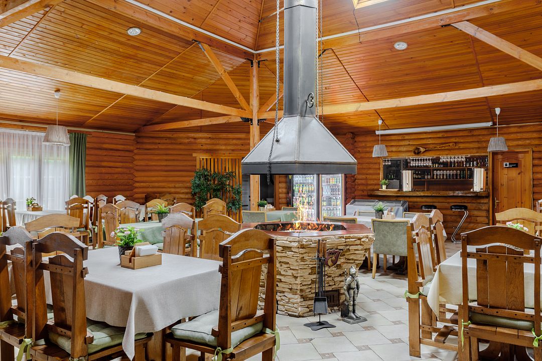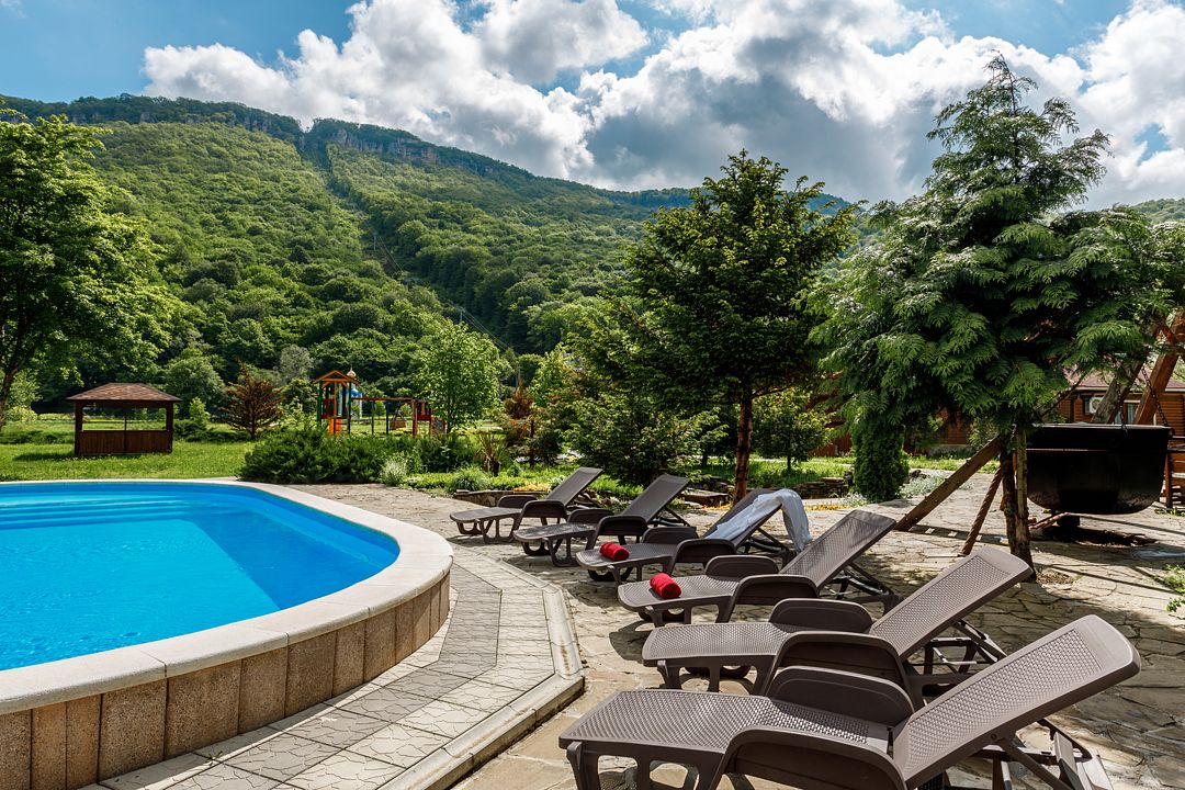 На территории комплекса работает кафе, оборудована барбекю-зона с мангалом, также в распоряжении гостей открытый бассейн, настоящая русская баня, где можно расслабиться после активного дня. Для автовладельцев организована охраняемая стоянка, а для детей предусмотрена игровая площадка.