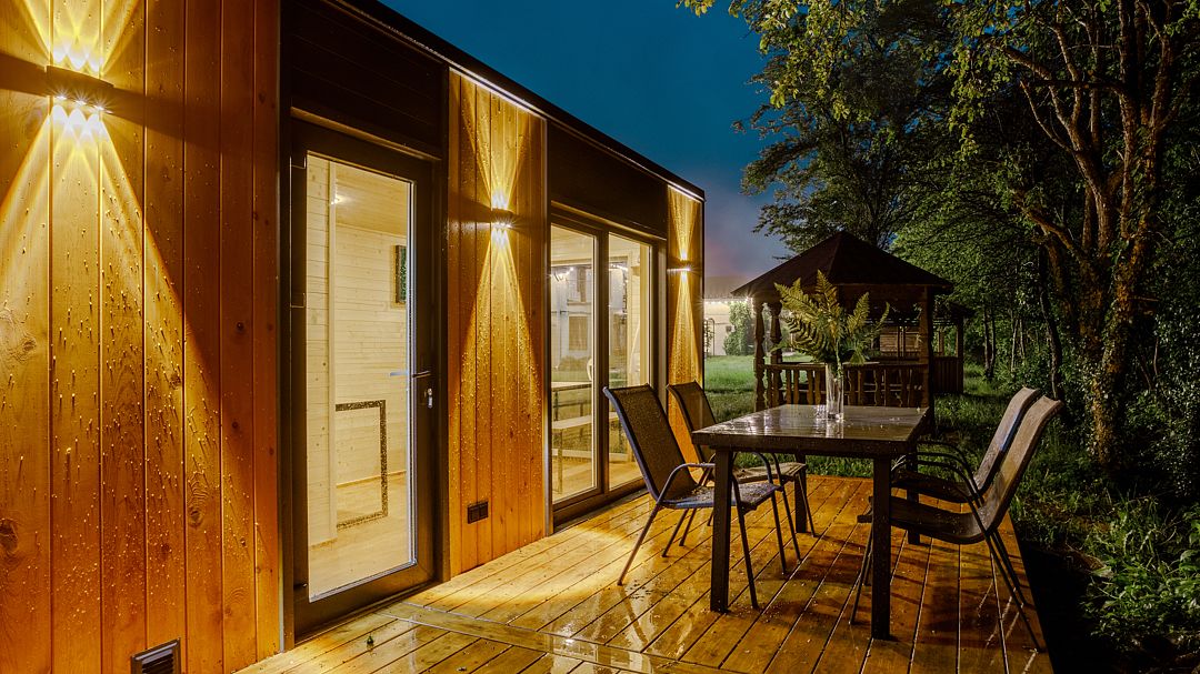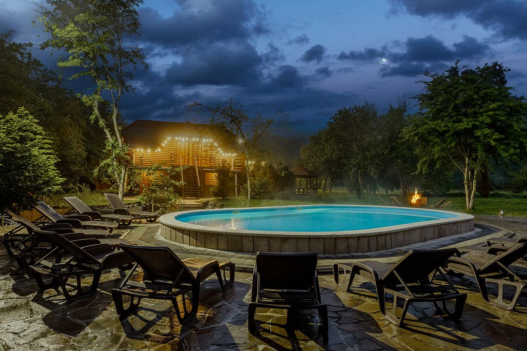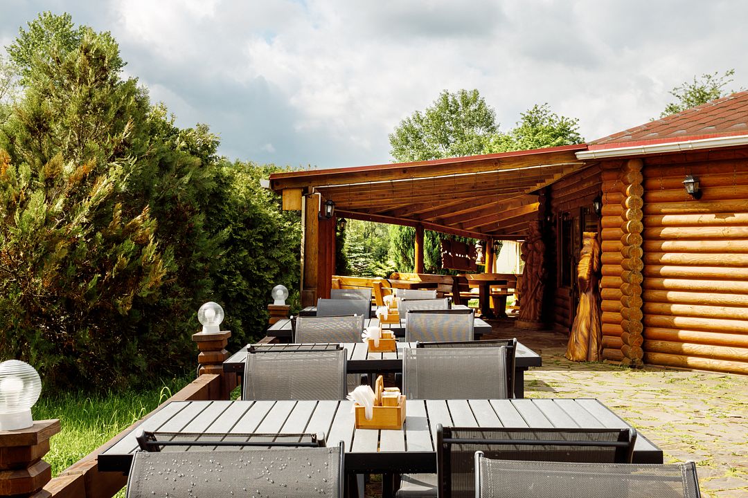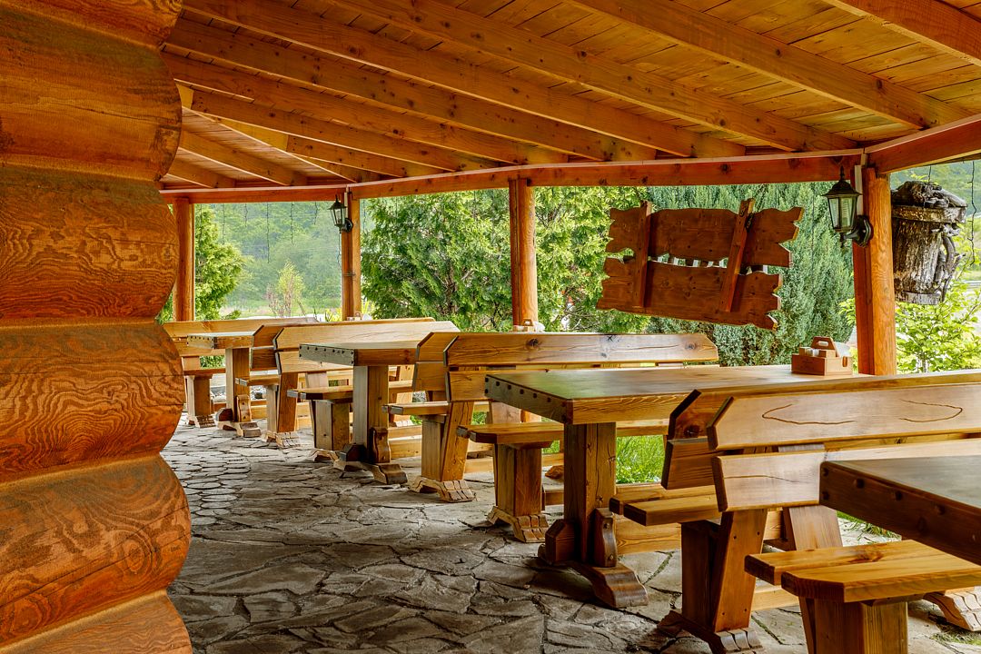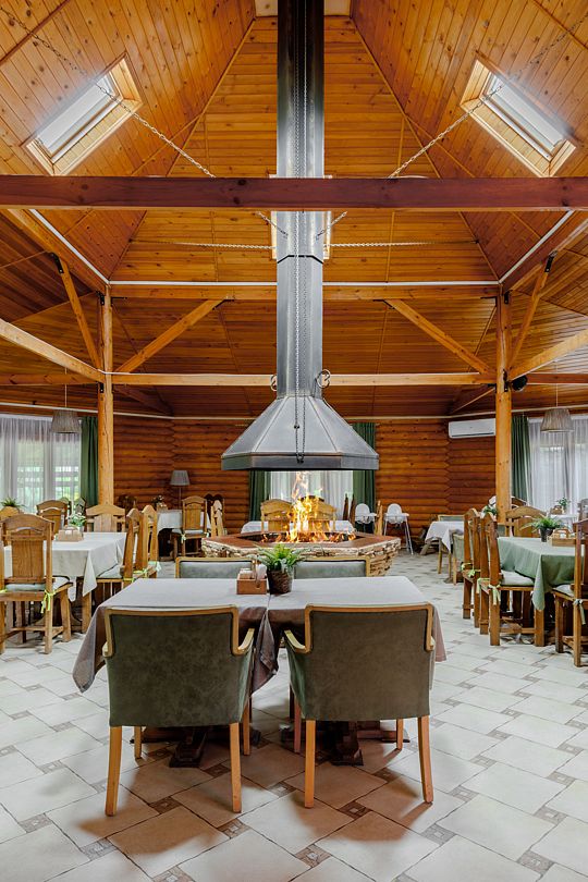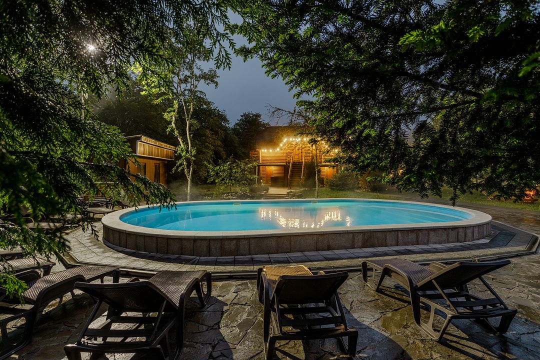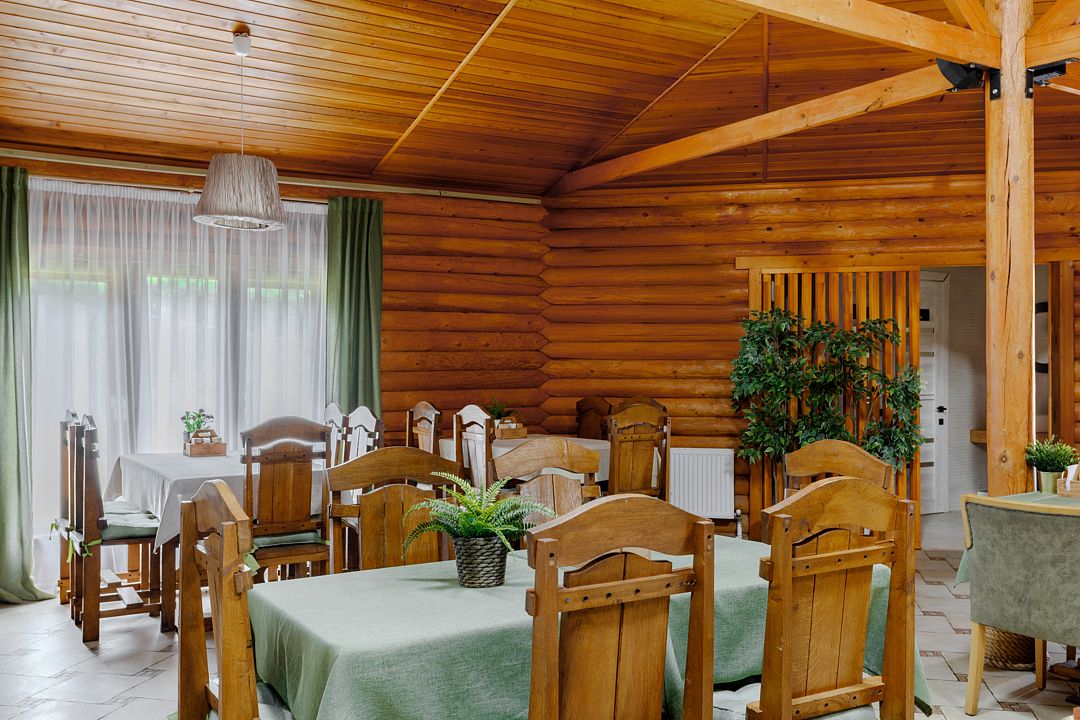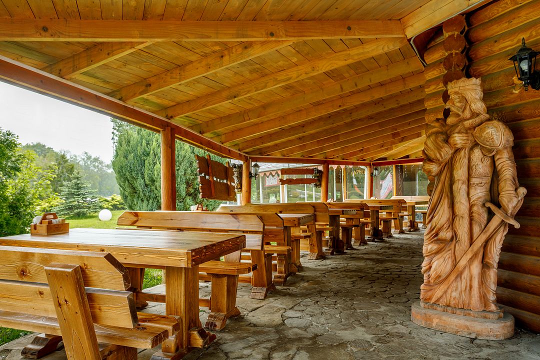 На территории комплекса работает кафе, оборудована барбекю-зона с мангалом, также в распоряжении гостей открытый бассейн, настоящая русская баня, где можно расслабиться после активного дня. Для автовладельцев организована охраняемая стоянка, а для детей предусмотрена игровая площадка.