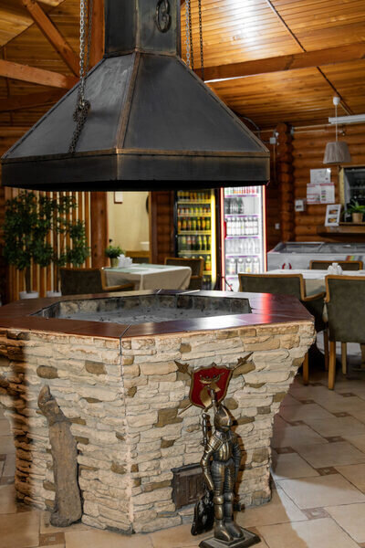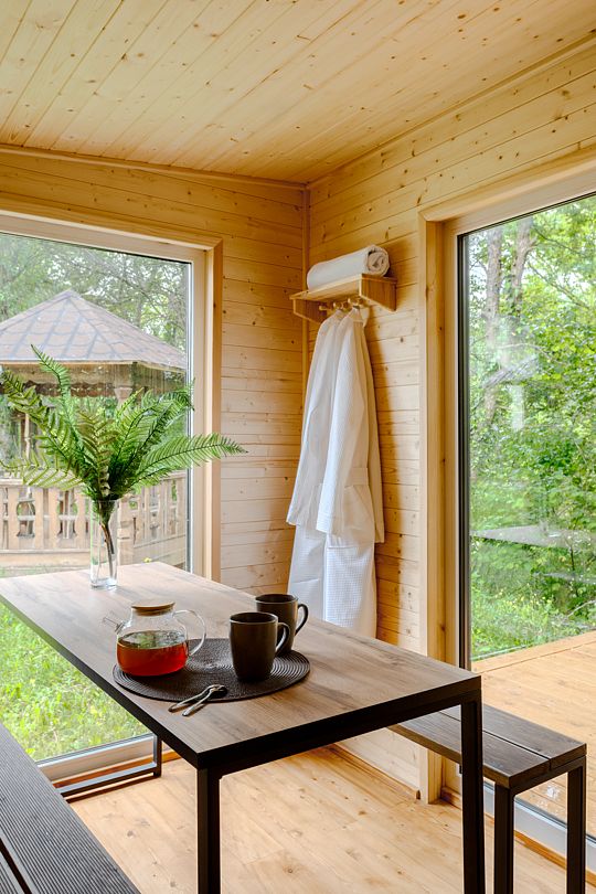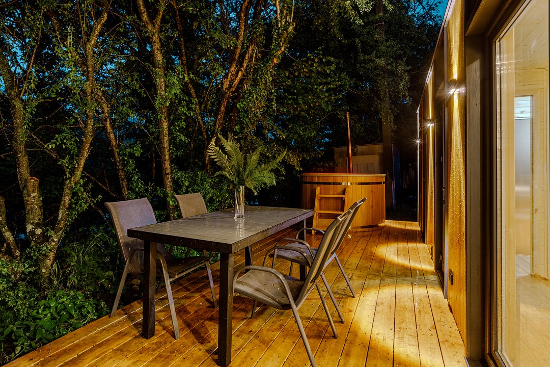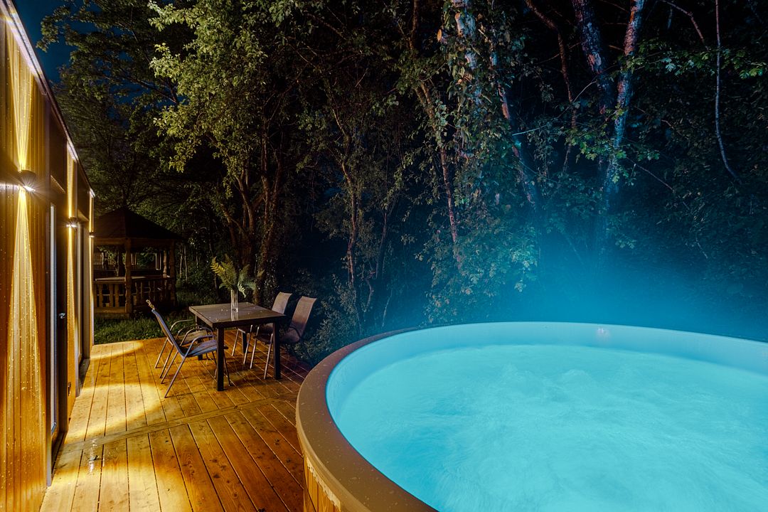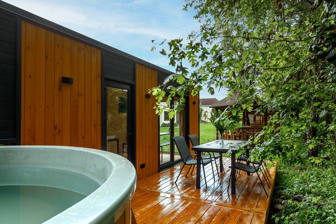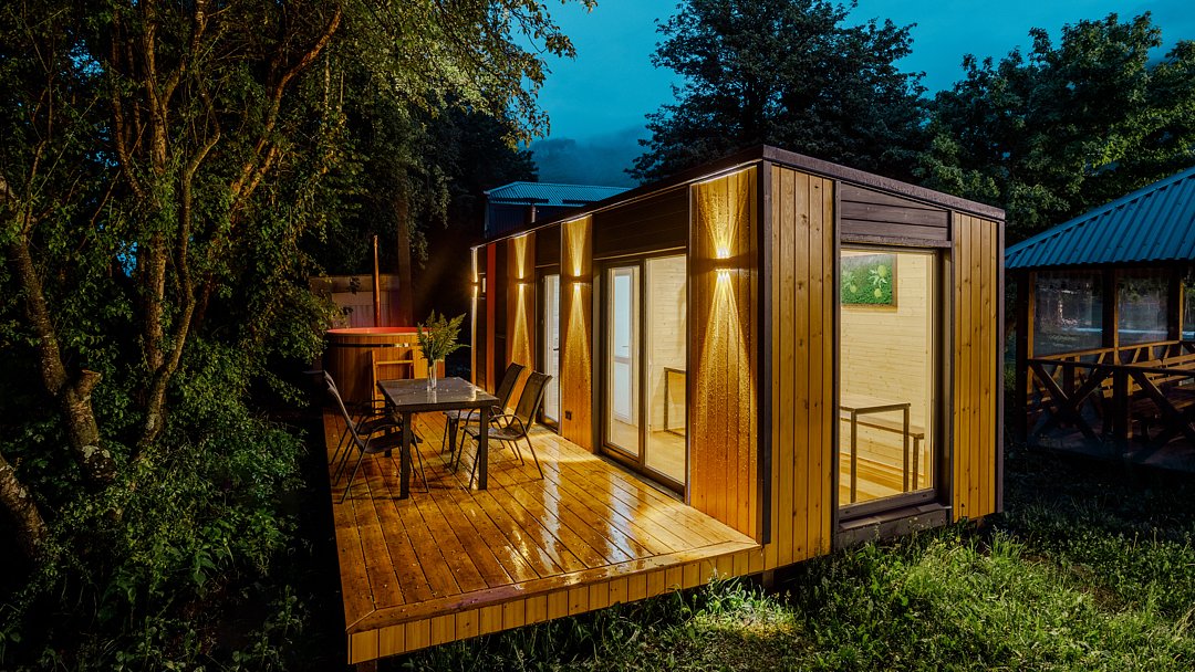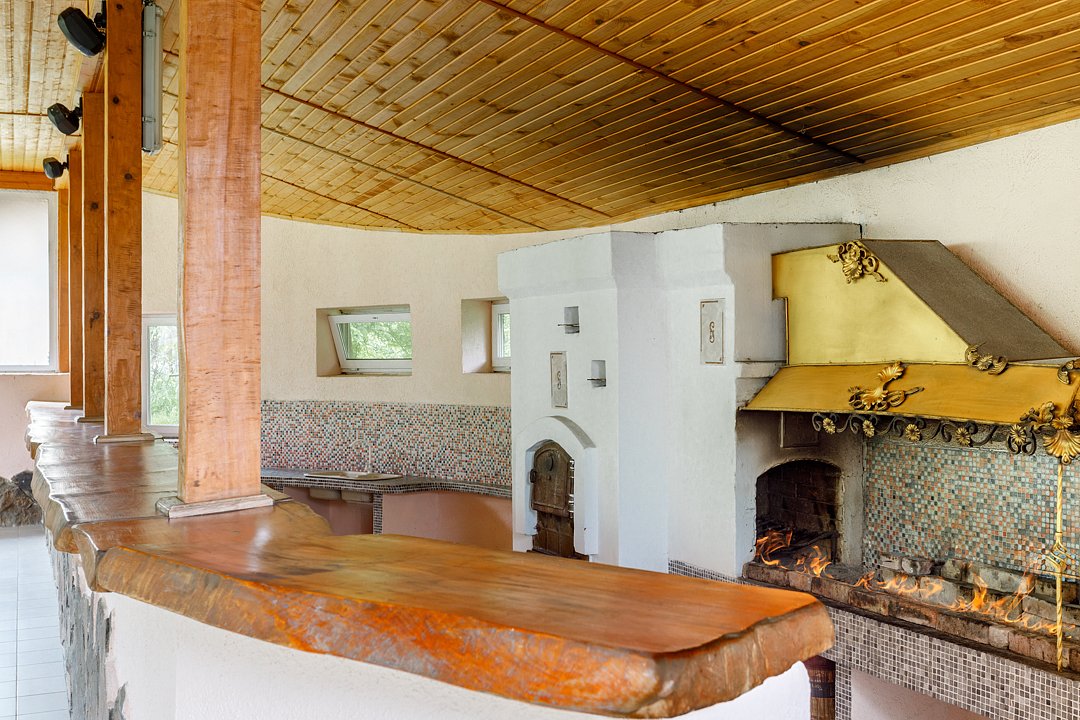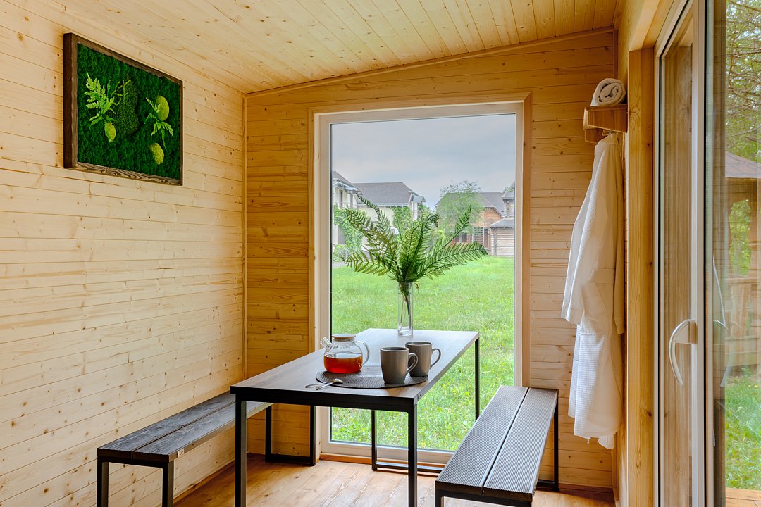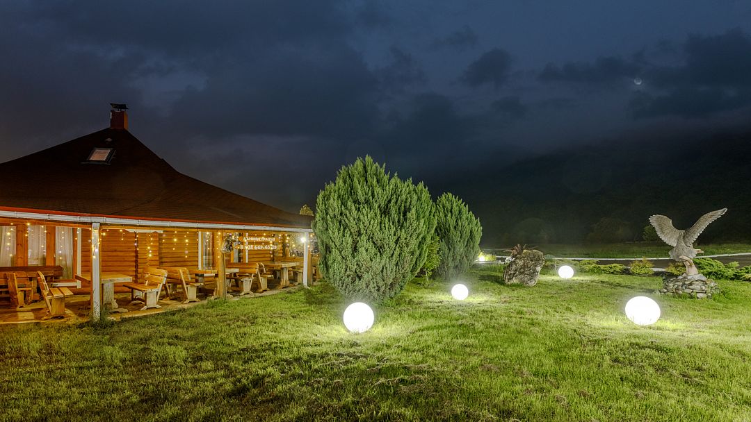 На территории комплекса работает кафе, оборудована барбекю-зона с мангалом, также в распоряжении гостей открытый бассейн, настоящая русская баня, где можно расслабиться после активного дня. Для автовладельцев организована охраняемая стоянка, а для детей предусмотрена игровая площадка.