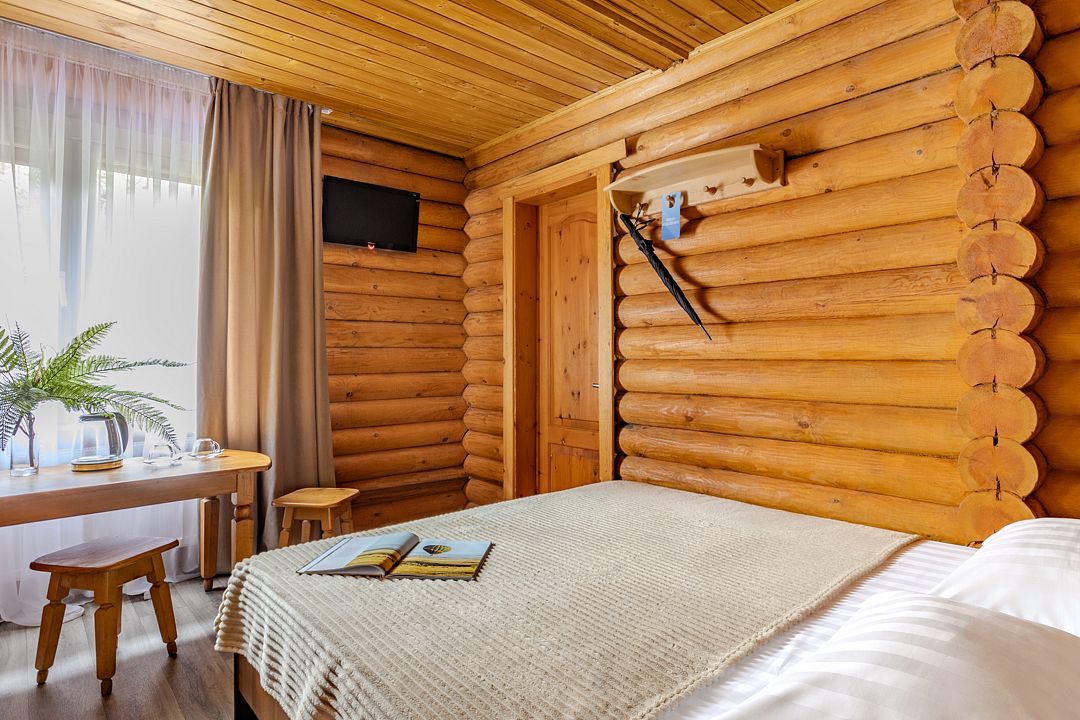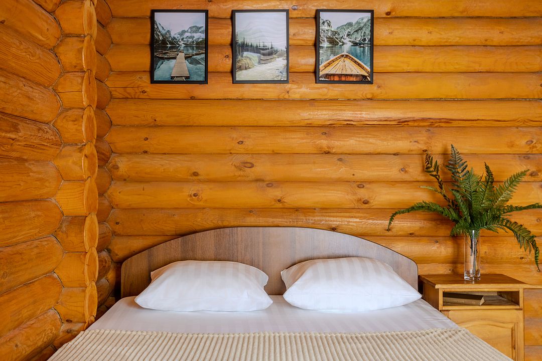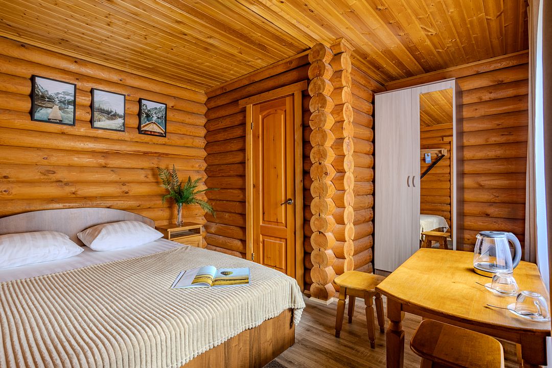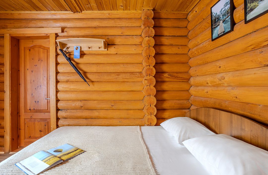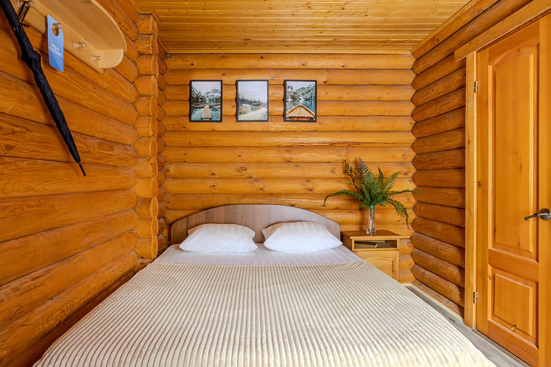 Стандартный двухместный номер с двуспальной кроватью в деревянном срубе с отдельным входом.