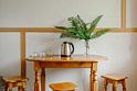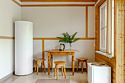 На веранде гостиная зона: стол, кресла, холодильник, чайник, вешалка для одежды.