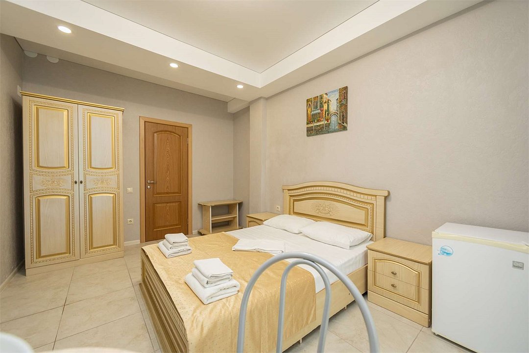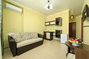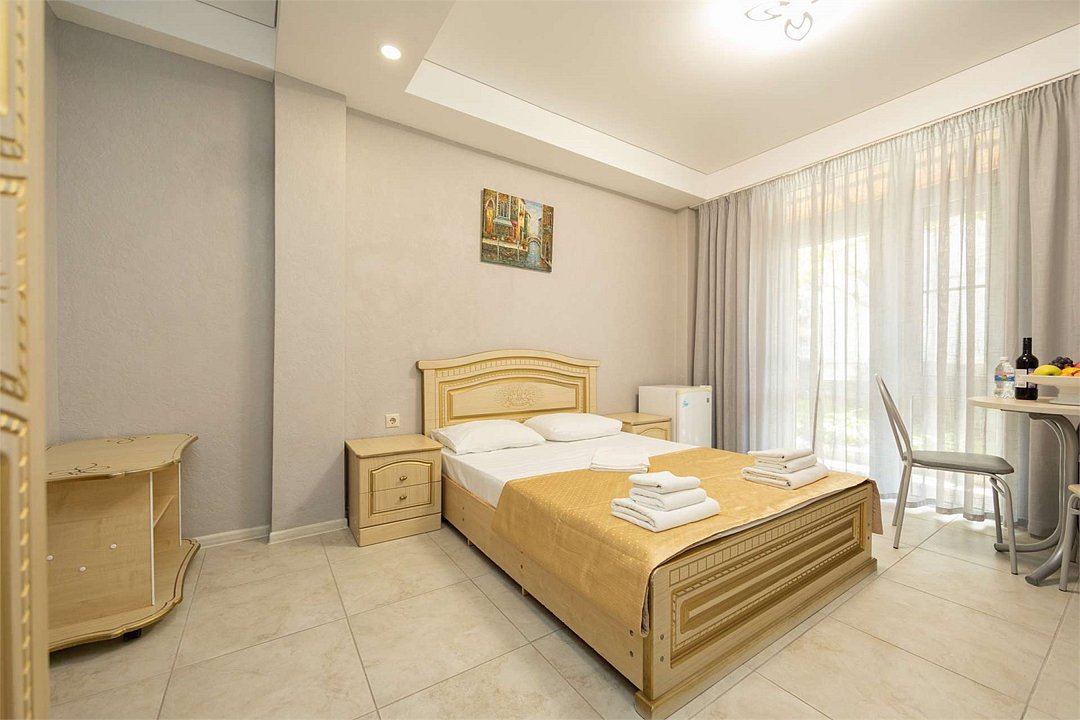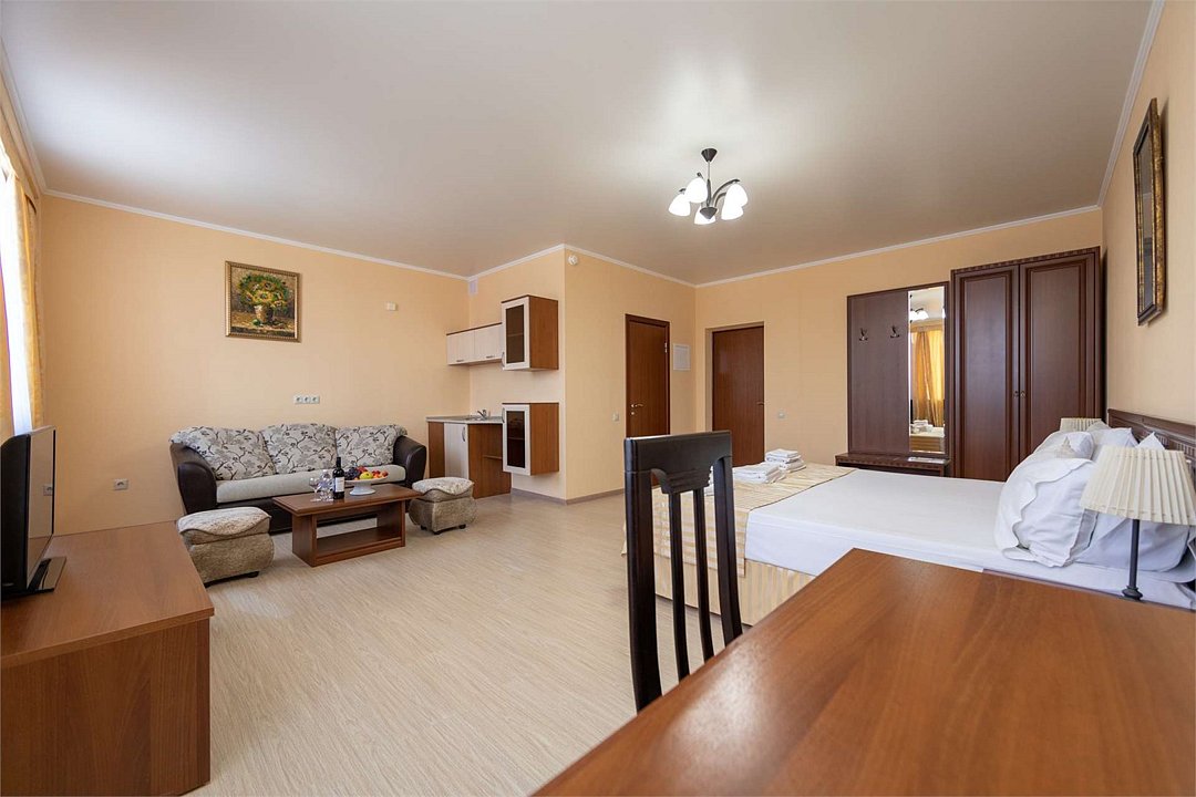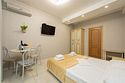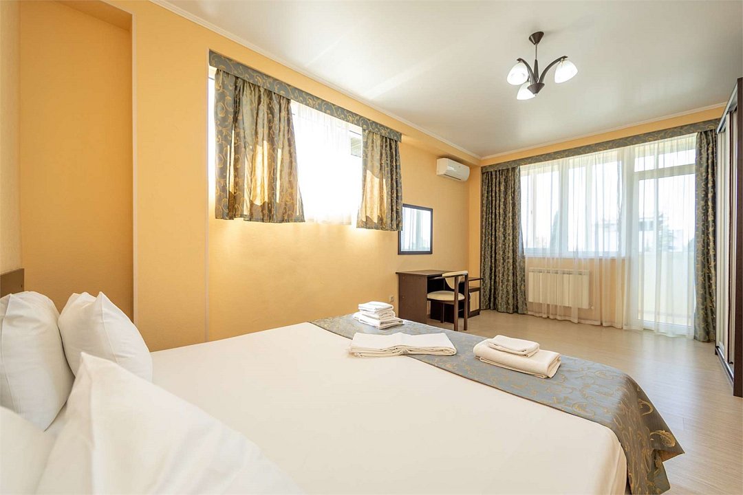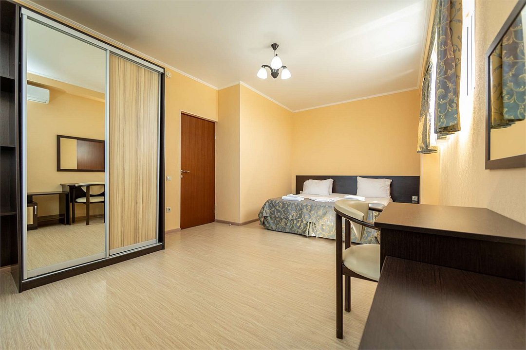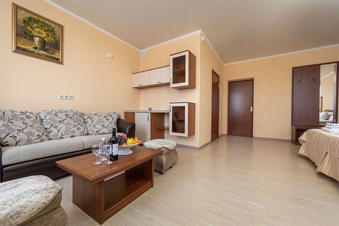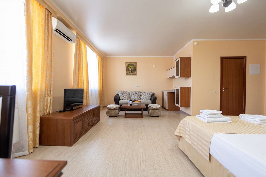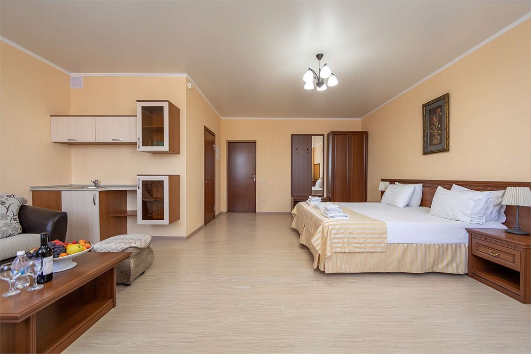 Комплектация и описание номера: Однокомнатный номер общей площадью 35 м2. В номере: двуспальная кровать, прикроватные тумбочки, двуспальный раскладной диван, шкаф, стол, стулья и другая мебель, мини-кухня. Компактная кухонная зона для мытья фруктов и посуды. Приготовление пищи здесь не предусмотрено. Возможно размещение на дополнительном месте. В качестве дополнительного места используется раскладной диван. При размещении с маленькими детьми, бесплатно устанавливается детская кроватка. Номера расположены на 2, 3 и 4 этажах.Услуги и удобства