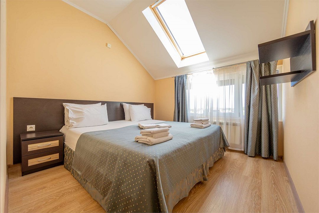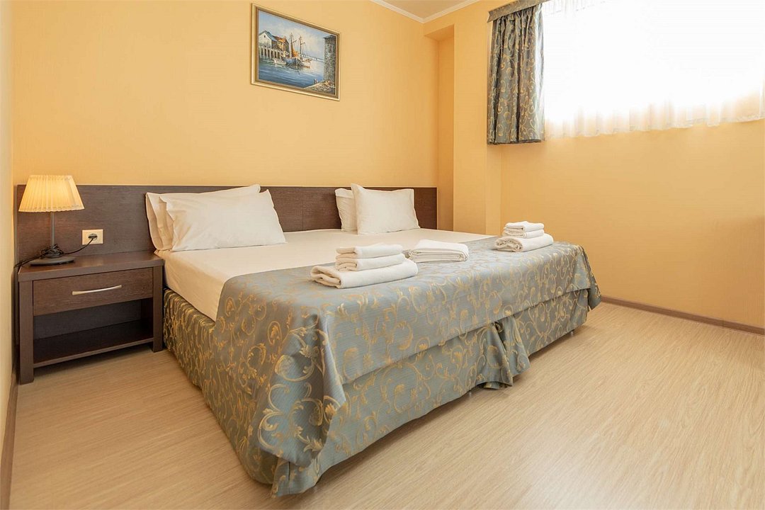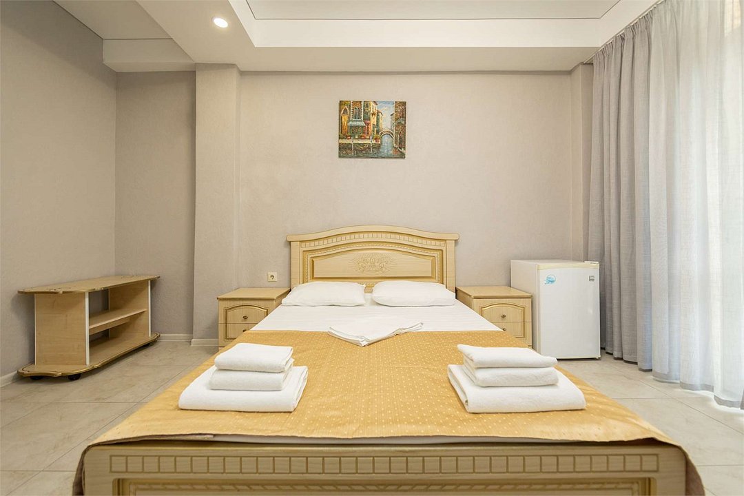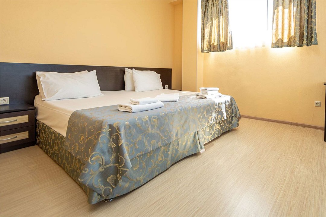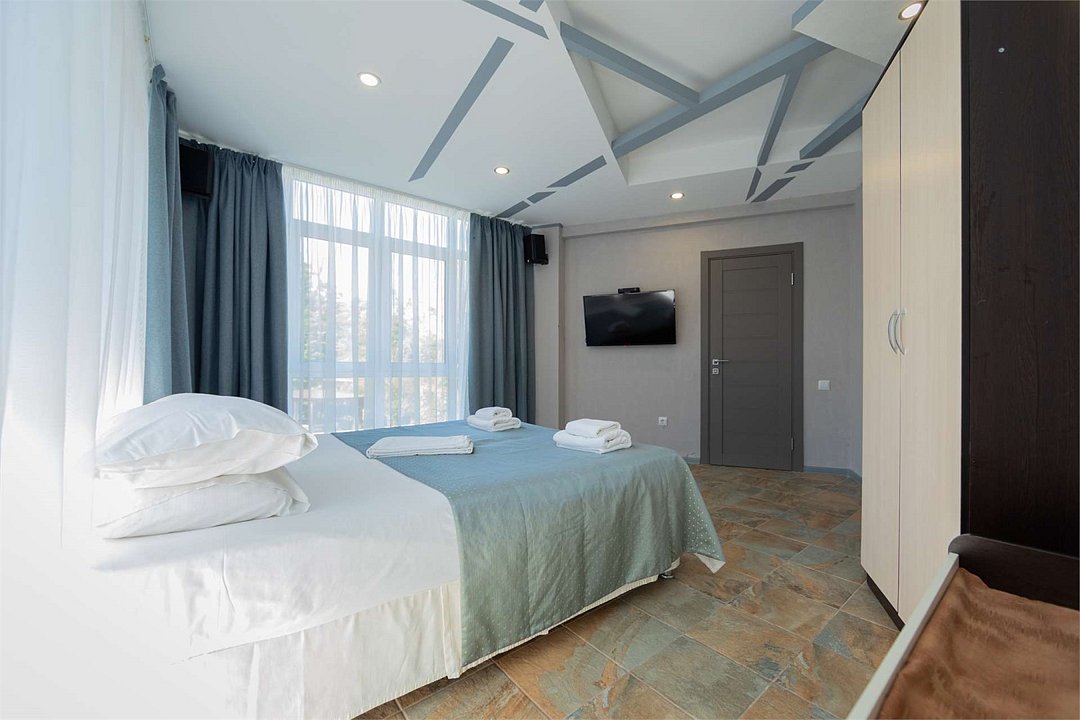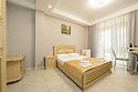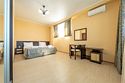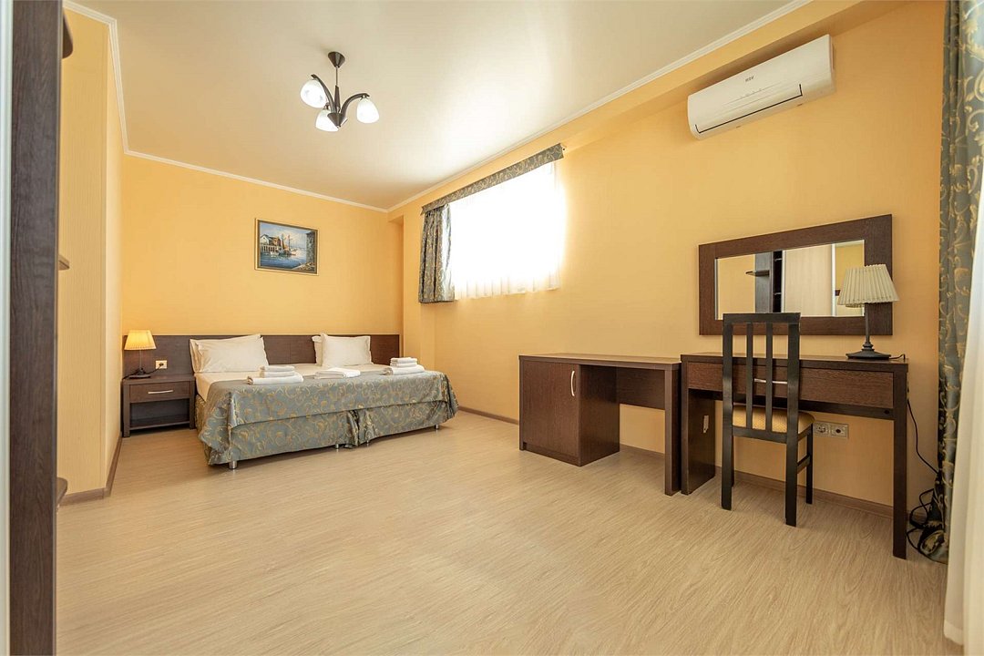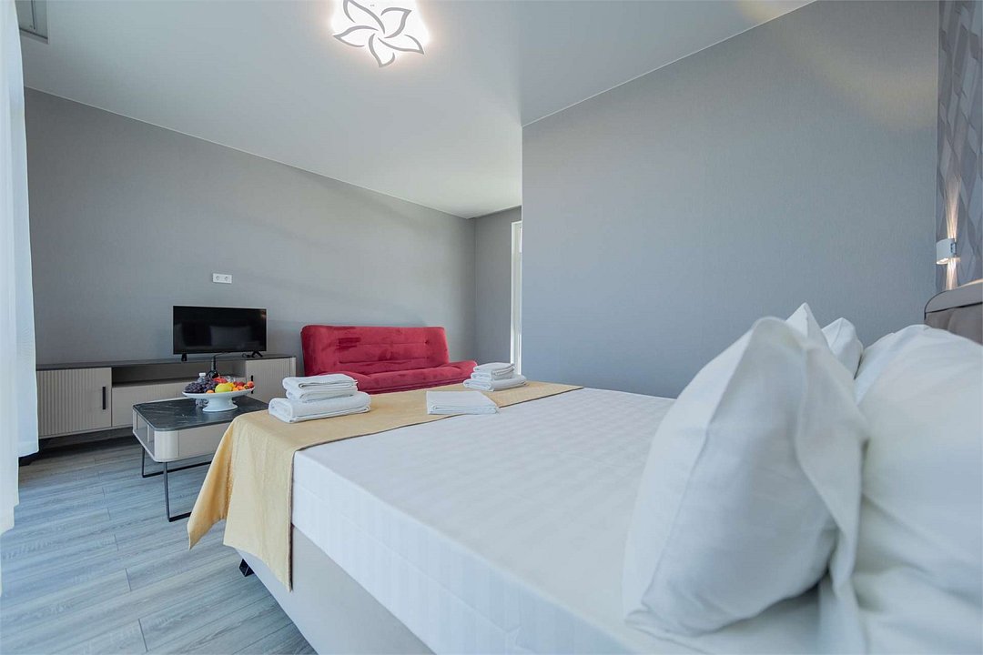 Комплектация и описание номера: Однокомнатный номер общей площадью 35 м2. В номере: двуспальная кровать, прикроватные тумбочки, двуспальный раскладной диван, шкаф, стол, стулья и другая мебель, мини-кухня. Компактная кухонная зона для мытья фруктов и посуды. Приготовление пищи здесь не предусмотрено. Возможно размещение на дополнительном месте. В качестве дополнительного места используется раскладной диван. При размещении с маленькими детьми, бесплатно устанавливается детская кроватка. Номера расположены на 2, 3 и 4 этажах.Услуги и удобства