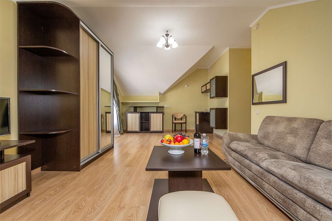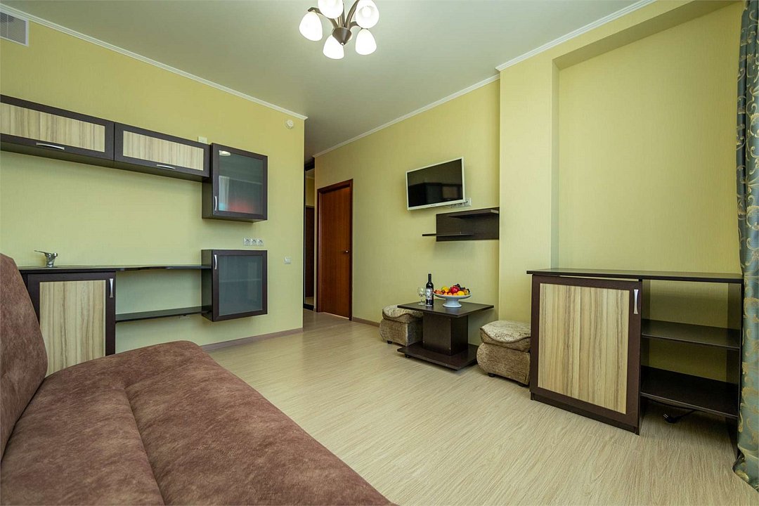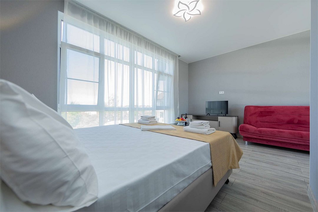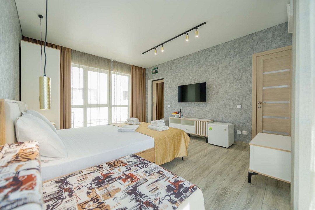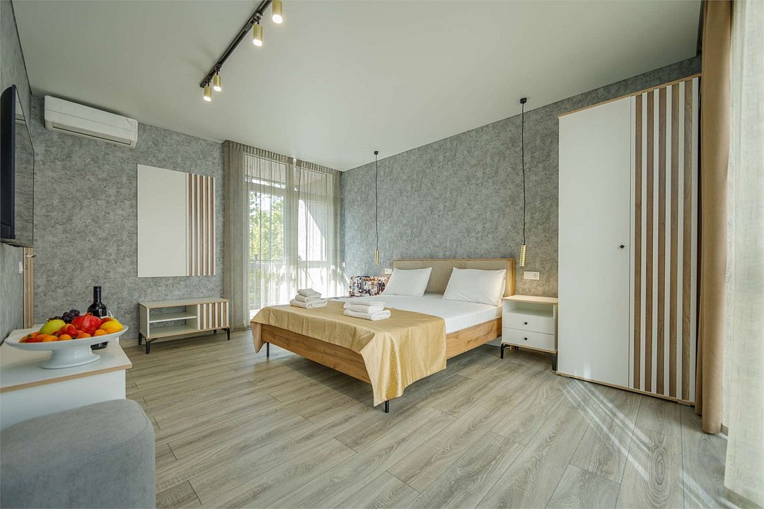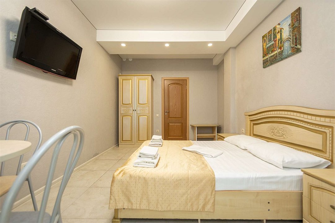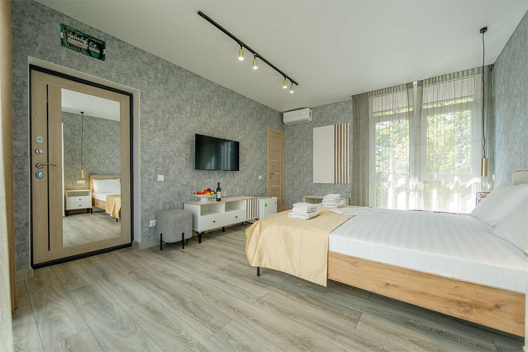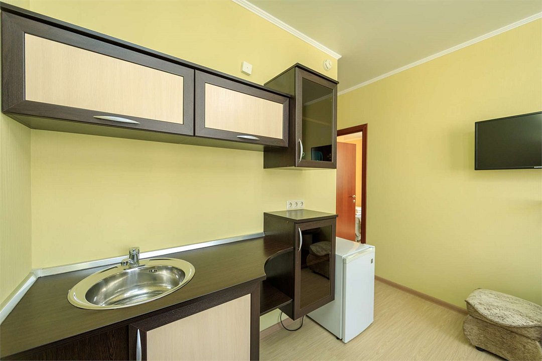 Комплектация и описание номера: Однокомнатный номер общей площадью 35 м2. В номере: двуспальная кровать, прикроватные тумбочки, двуспальный раскладной диван, шкаф, стол, стулья и другая мебель, мини-кухня. Компактная кухонная зона для мытья фруктов и посуды. Приготовление пищи здесь не предусмотрено. Возможно размещение на дополнительном месте. В качестве дополнительного места используется раскладной диван. При размещении с маленькими детьми, бесплатно устанавливается детская кроватка. Номера расположены на 2, 3 и 4 этажах.Услуги и удобства