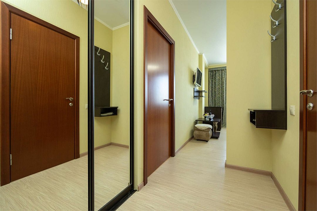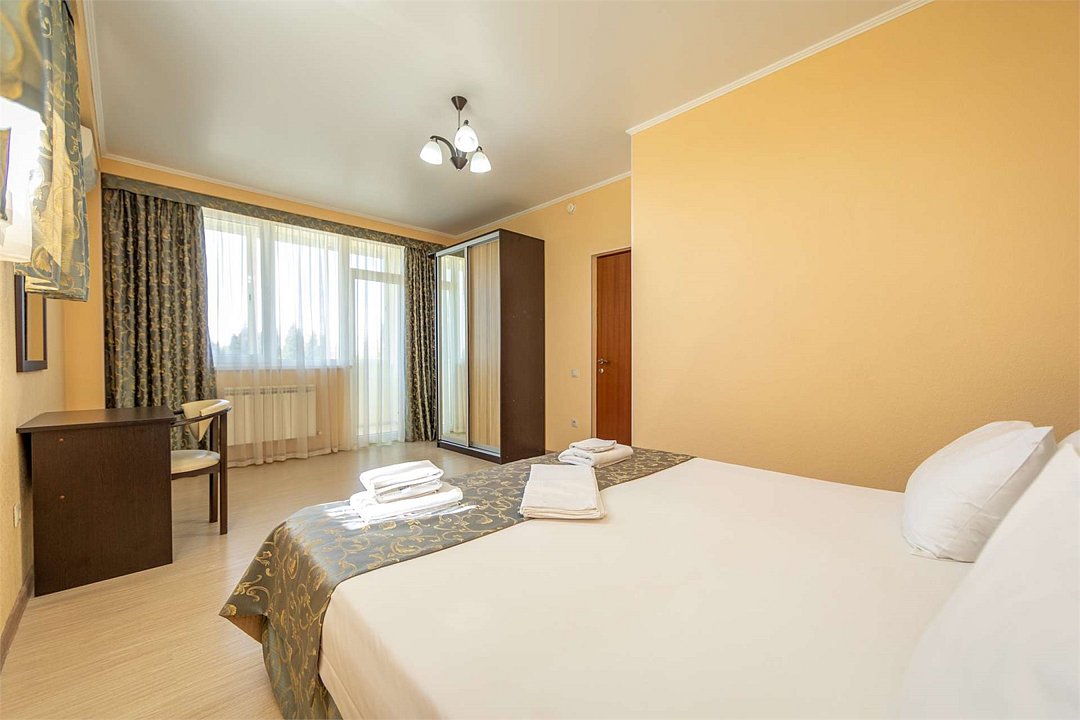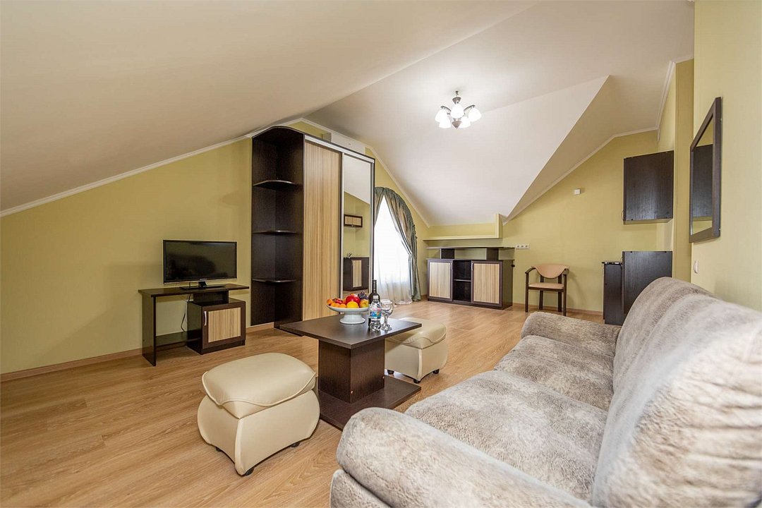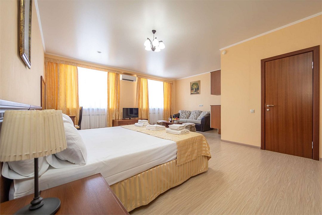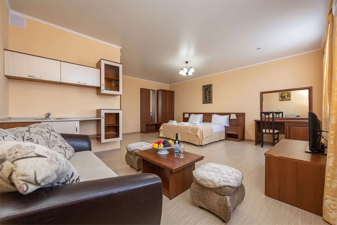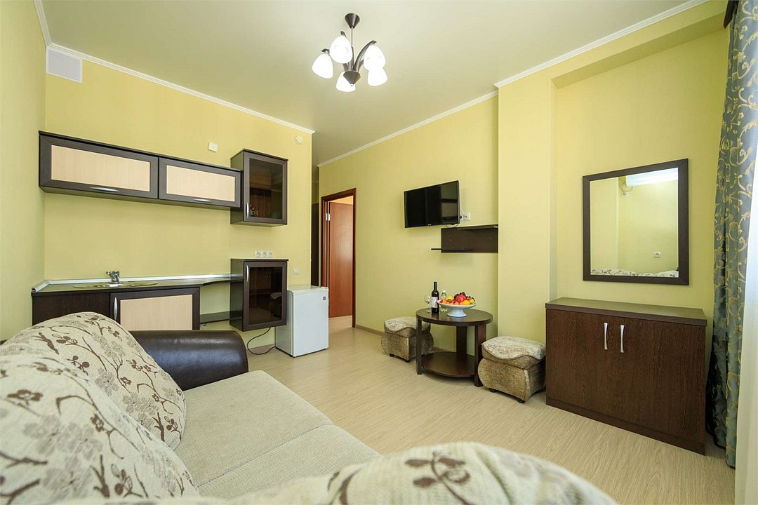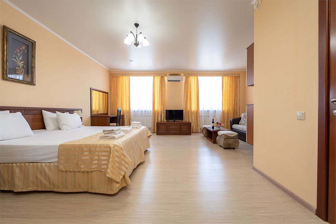 Комплектация и описание номера: Двухкомнатный номер общей площадью 40 м2. В номере: двуспальная кровать, прикроватные тумбочки, двуспальный диван, шкаф, стол, стулья и прочая мебель, мини-кухня. Компактная кухонная зона, предназначенная для мытья фруктов и посуды, но не для приготовления пищи. Возможно размещение на дополнительном месте. В качестве дополнительного места служит раскладной диван. При размещении с маленькими детьми, по запросу, бесплатно устанавливается детская кроватка. Номера расположены на 1 и 4 этажах.Услуги и удобства