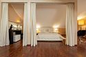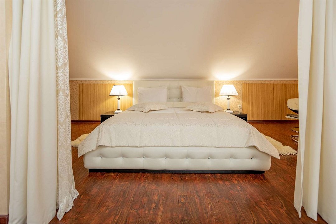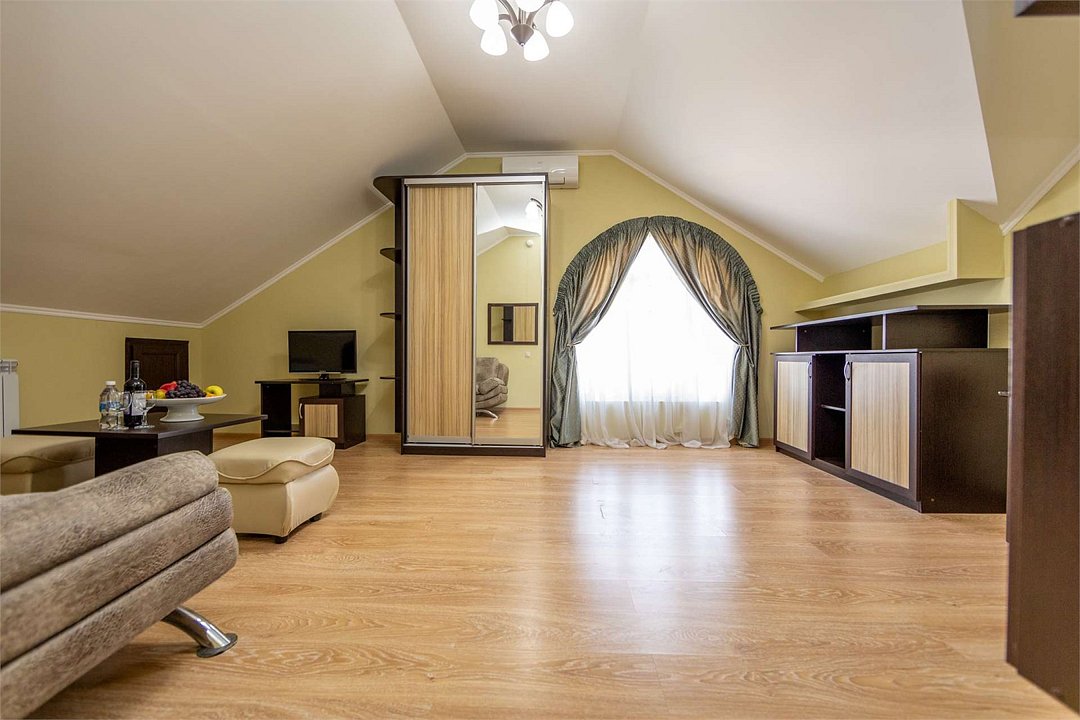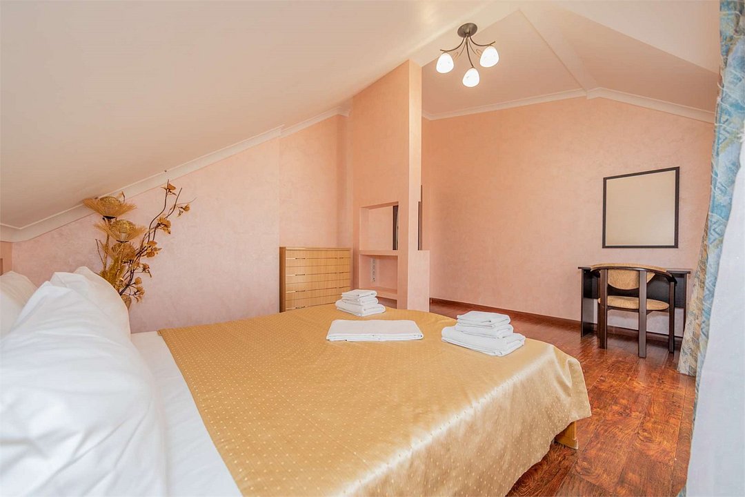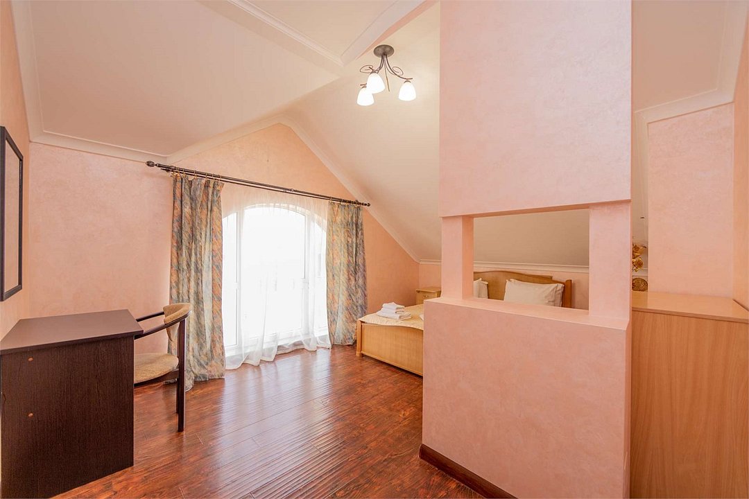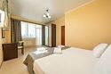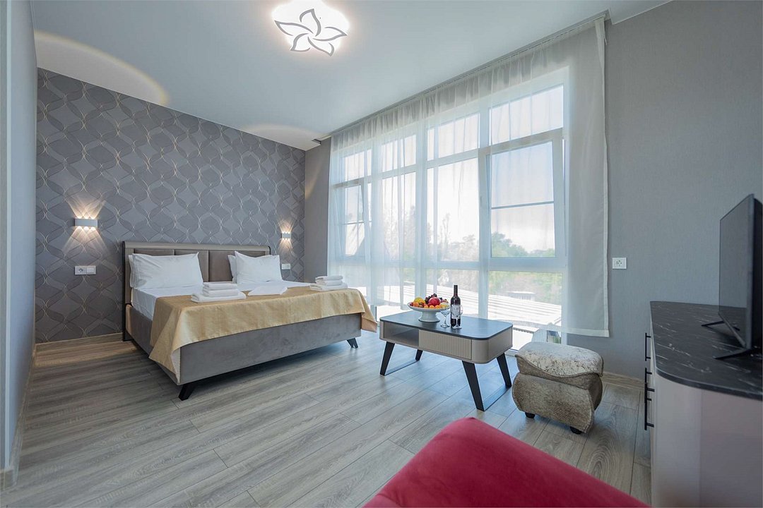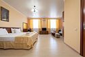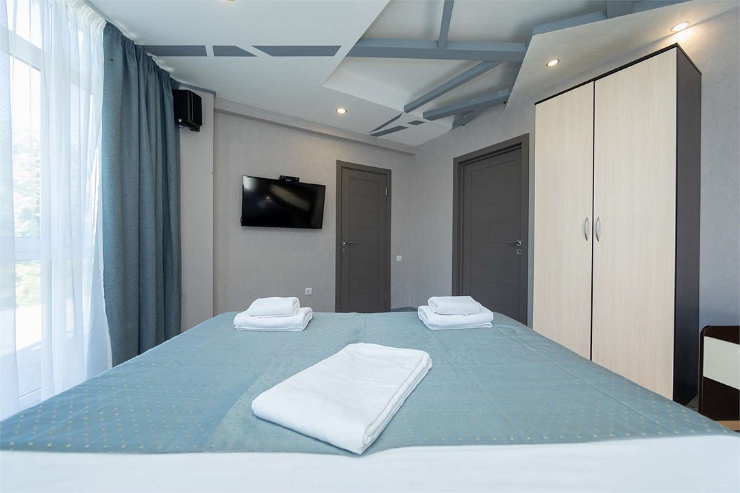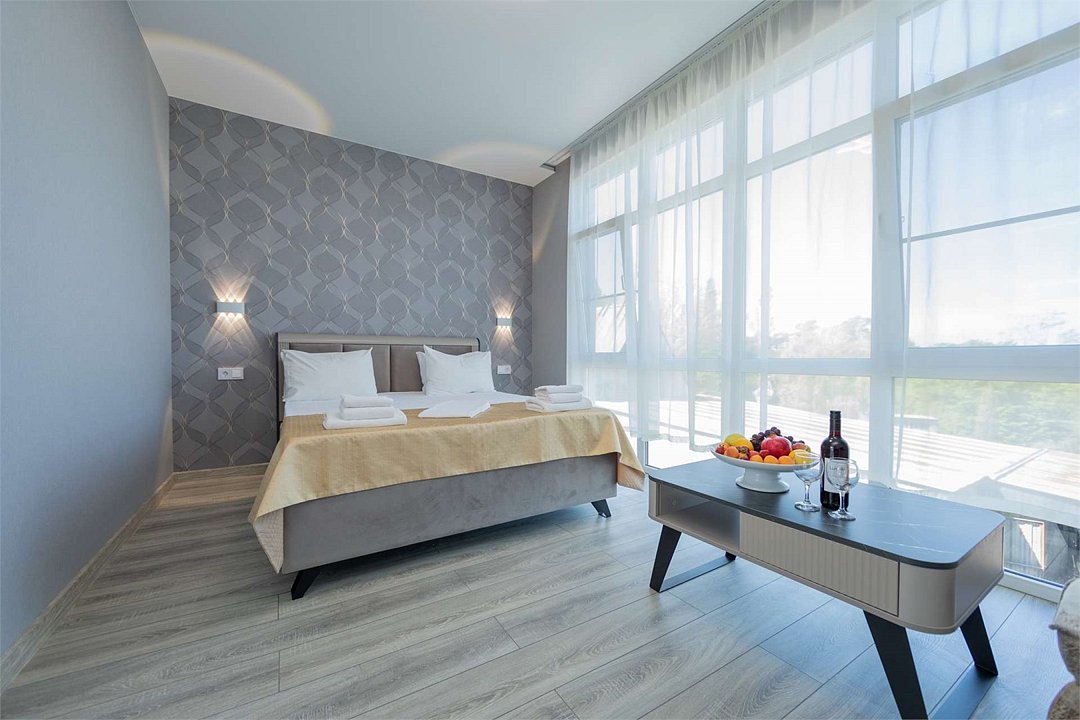 Комплектация и описание номера: Двухкомнатный номер общей площадью 40 м2. В номере: двуспальная кровать, прикроватные тумбочки, двуспальный диван, шкаф, стол, стулья и прочая мебель, мини-кухня. Компактная кухонная зона, предназначенная для мытья фруктов и посуды, но не для приготовления пищи. Возможно размещение на дополнительном месте. В качестве дополнительного места служит раскладной диван. При размещении с маленькими детьми, по запросу, бесплатно устанавливается детская кроватка. Номера расположены на 1 и 4 этажах.Услуги и удобства
