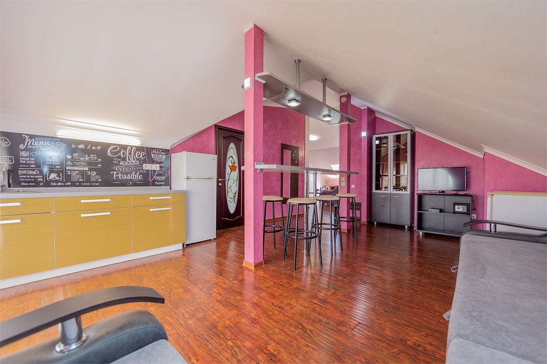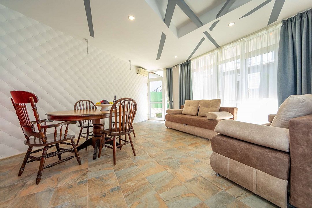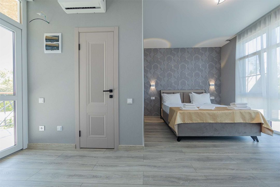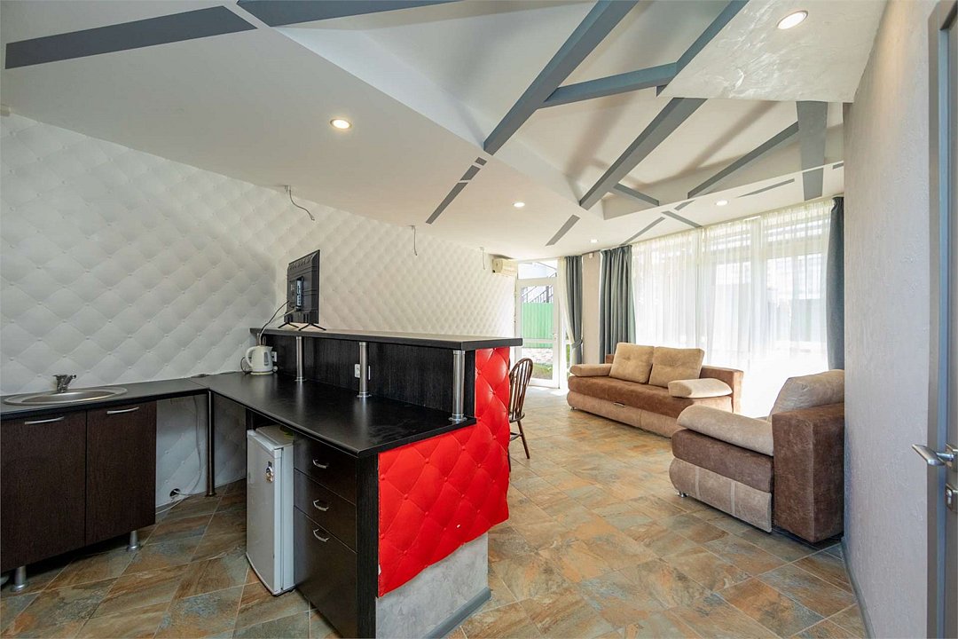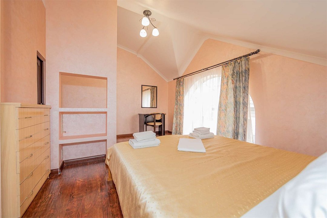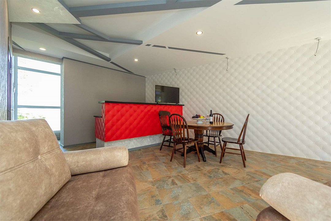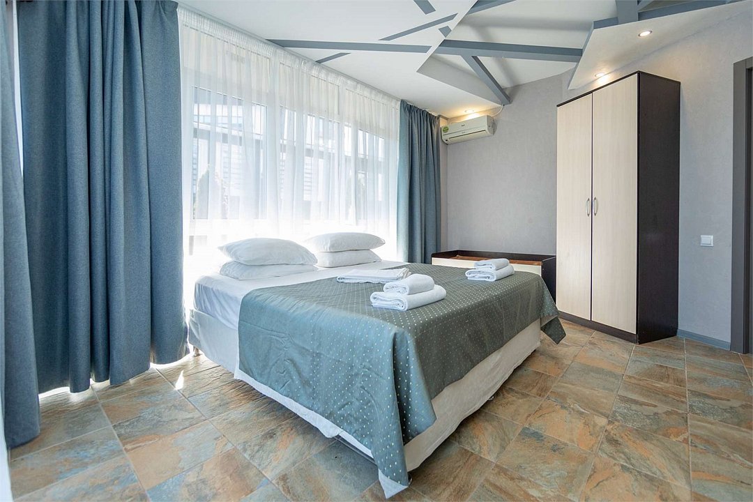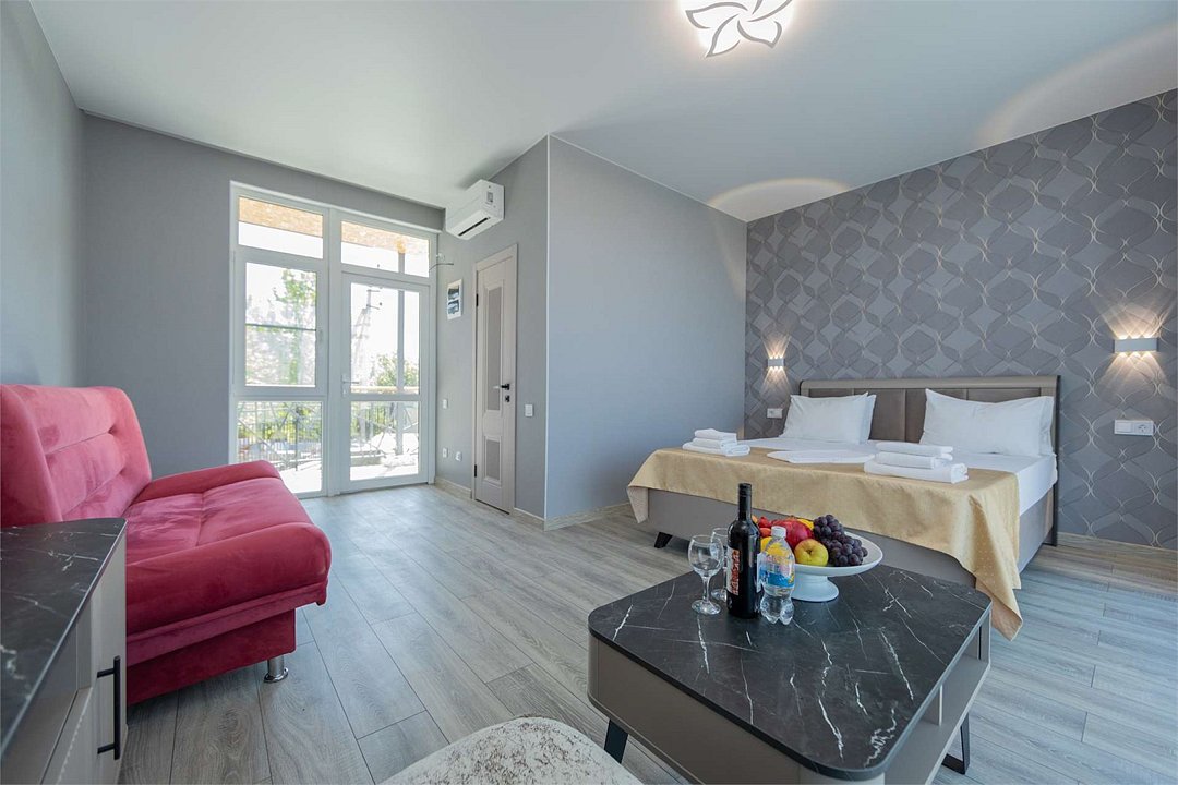 Комплектация и описание номера: В номере: двуспальная кровать, прикроватные тумбочки, два двуспальных раскладных дивана, шкаф, стол, стулья и прочая мебель, мини-кухня. Компактная кухонная зона, предназначенная для мытья фруктов и посуды, но не для приготовления пищи. Дополнительными местами служит раскладной диван. Возможно размещение более четырёх человек по запросу. При размещении с маленькими детьми, бесплатно устанавливается детская кроватка. Номер в единственном исполнении, расположен на территории рядом с бассейном.Услуги и удобства