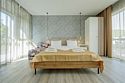 телевизор, Wi-Fi, кондиционер, фен, ванна, банные полотенца, балкон, двуспальная кровать, тумбы, стулья, журнальный столик, зеркало, сейф, раковина, туалетный столик, туалет, раскладной диван, мини-холодильник, шкаф-купе, гостиничная парфюмерия, пуфикВ гостиничном номере