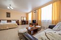 Комплектация и описание номера: Двухкомнатный комфортабельный номер площадью 40 м2. В номере: двуспальная кровать, прикроватные тумбочки, двуспальный диван, шкаф, стол, стулья и прочая мебель, мини-кухня. Компактная кухонная зона, предназначенная для мытья фруктов и посуды, но не для приготовления пищи. Возможно размещение на дополнительном месте. В качестве дополнительного места служит раскладной диван, расположенный во второй комнате. При размещении с маленькими детьми, по запросу гостей, бесплатно устанавливается детская кроватка. Номера данной категории расположены на 1 и 4 этажах.Услуги и удобства