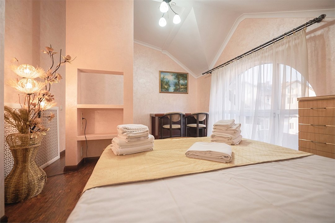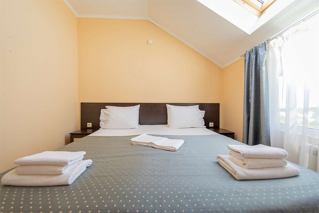 Комплектация и описание номера: Однокомнатный номер общей площадью 25 м2. В номере: двуспальная кровать, кресло-кровать, прикроватные тумбочки, шкаф, стол, стулья и прочая мебель. Возможно размещение на дополнительном месте. В качестве дополнительного места служит кресло-кровать. При размещении с маленькими детьми, по запросу, бесплатно устанавливается детская кроватка. Номера расположены на 1 и 2 этажах.Услуги и удобства