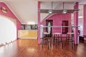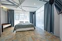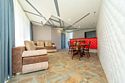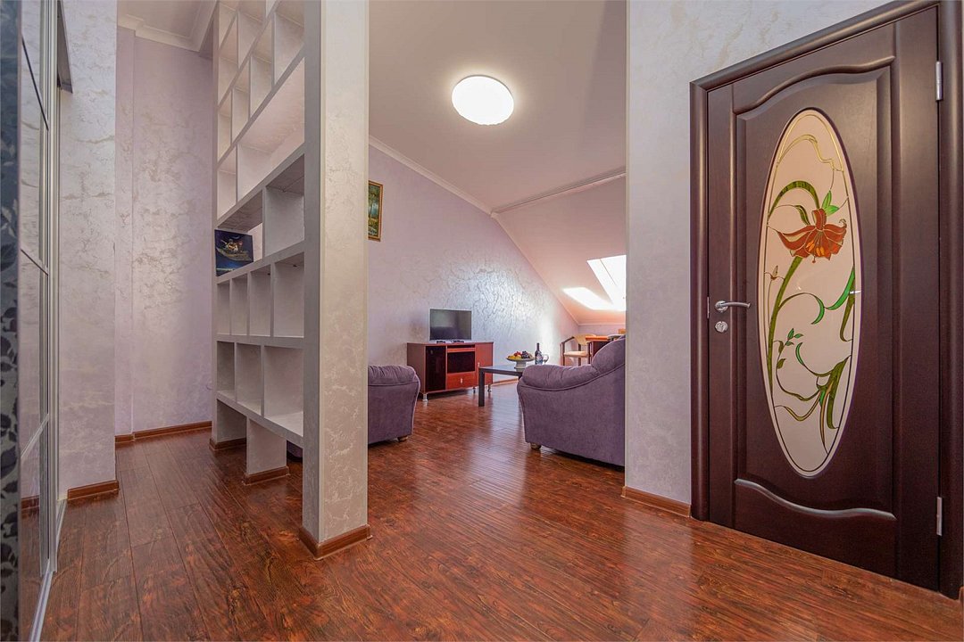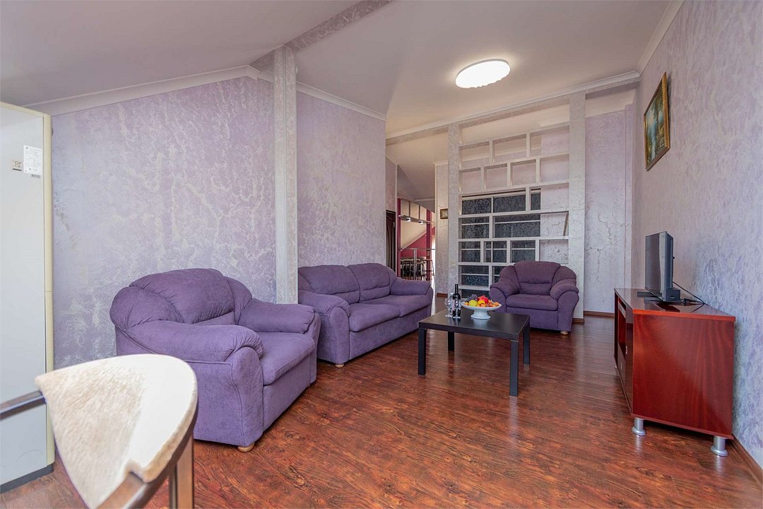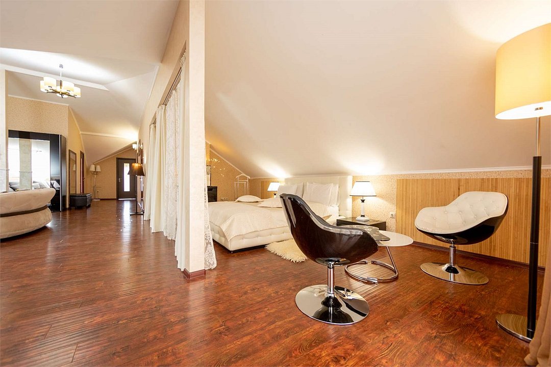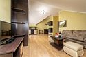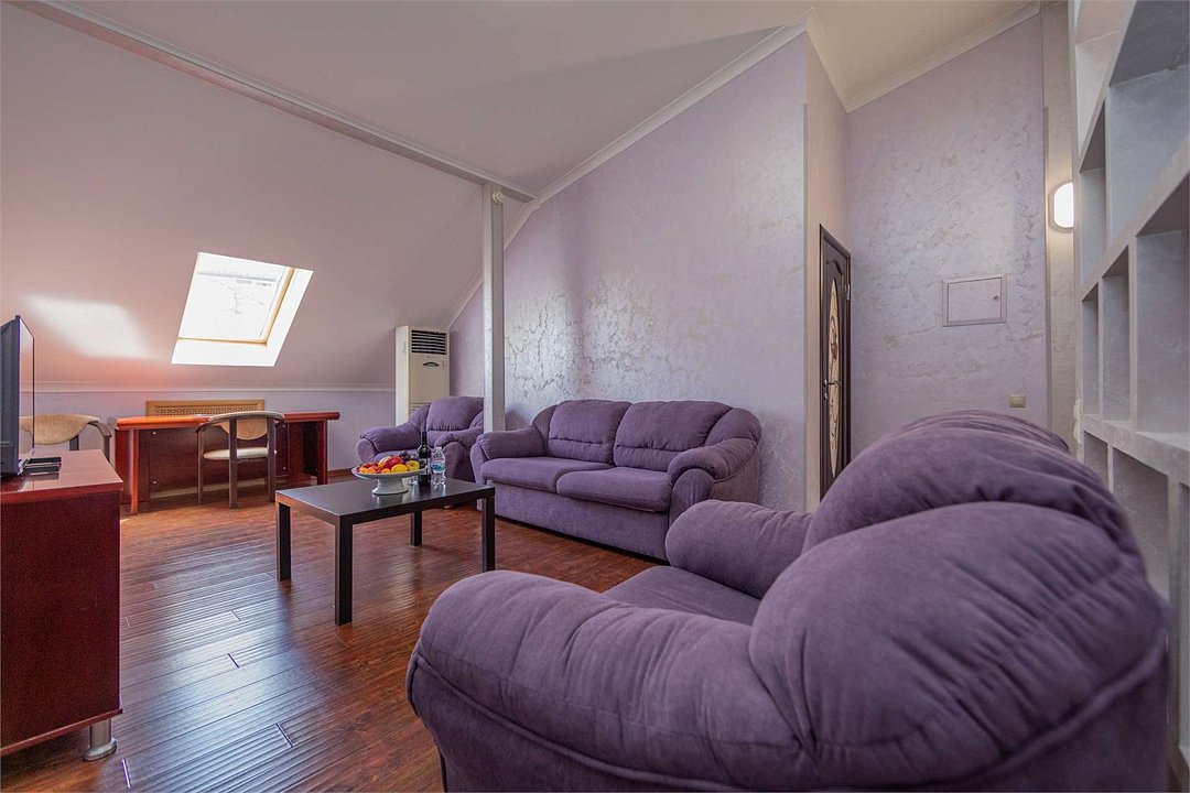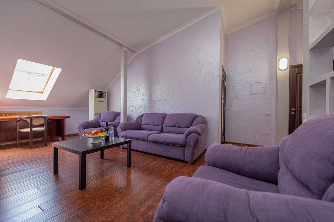 Комплектация и описание номера: Комфортабельный номер с авторским дизайном общей площадью 125 м2. В номере: двуспальная кровать, диваны, письменный стол, шкаф, стол, стулья, кресла и прочая мебель, мини-кухня. Компактная кухонная зона, предназначенная для мытья фруктов и посуды, но не для приготовления пищи. В качестве дополнительного места служит раскладной диван, расположенный во второй комнате. По запросу возможно размещение более четырёх человек, в качестве дополнительного спального места предоставляется еврораскладушка. При размещении с маленькими детьми, по запросу гостей, бесплатно устанавливается детская кроватка. Номер в единственном исполнении, расположен на 4 этаже.Услуги и удобства