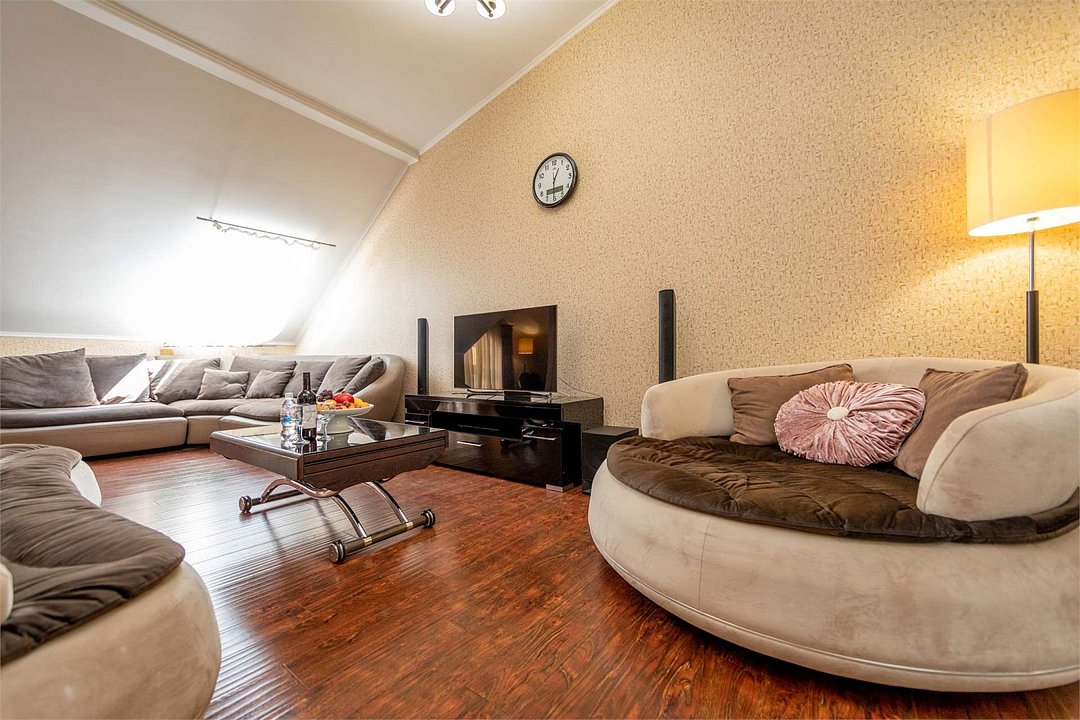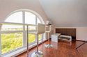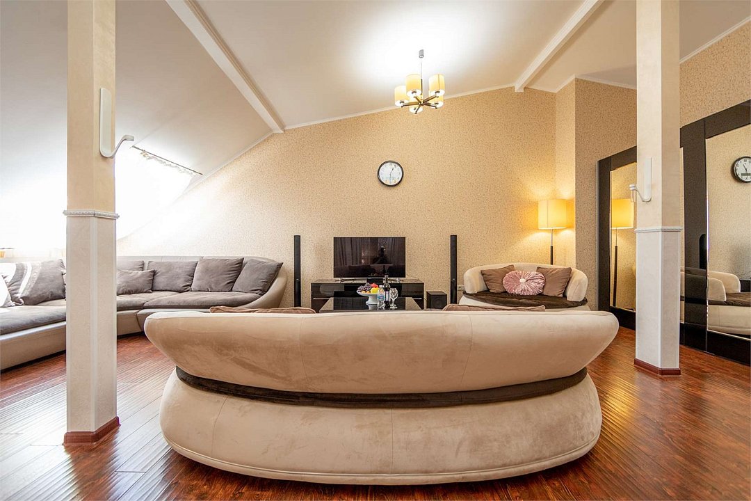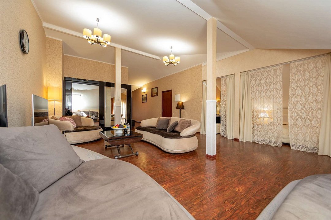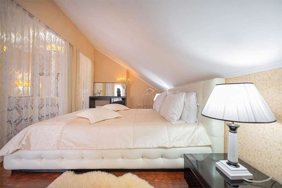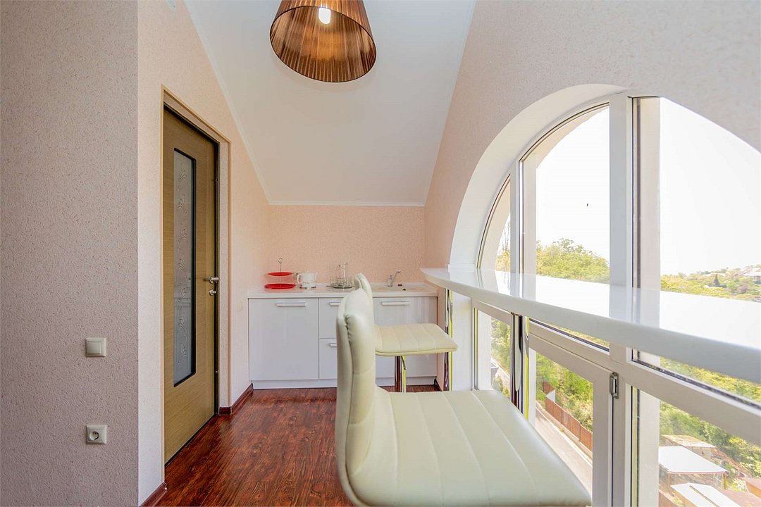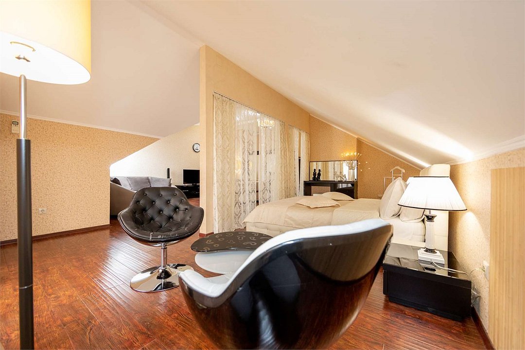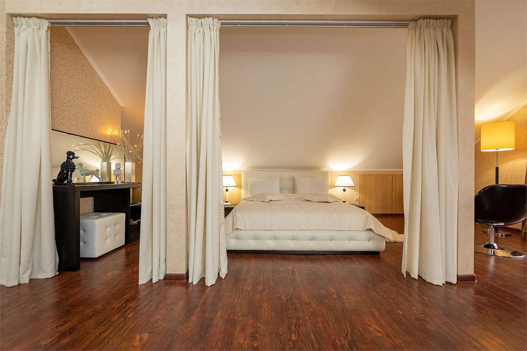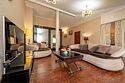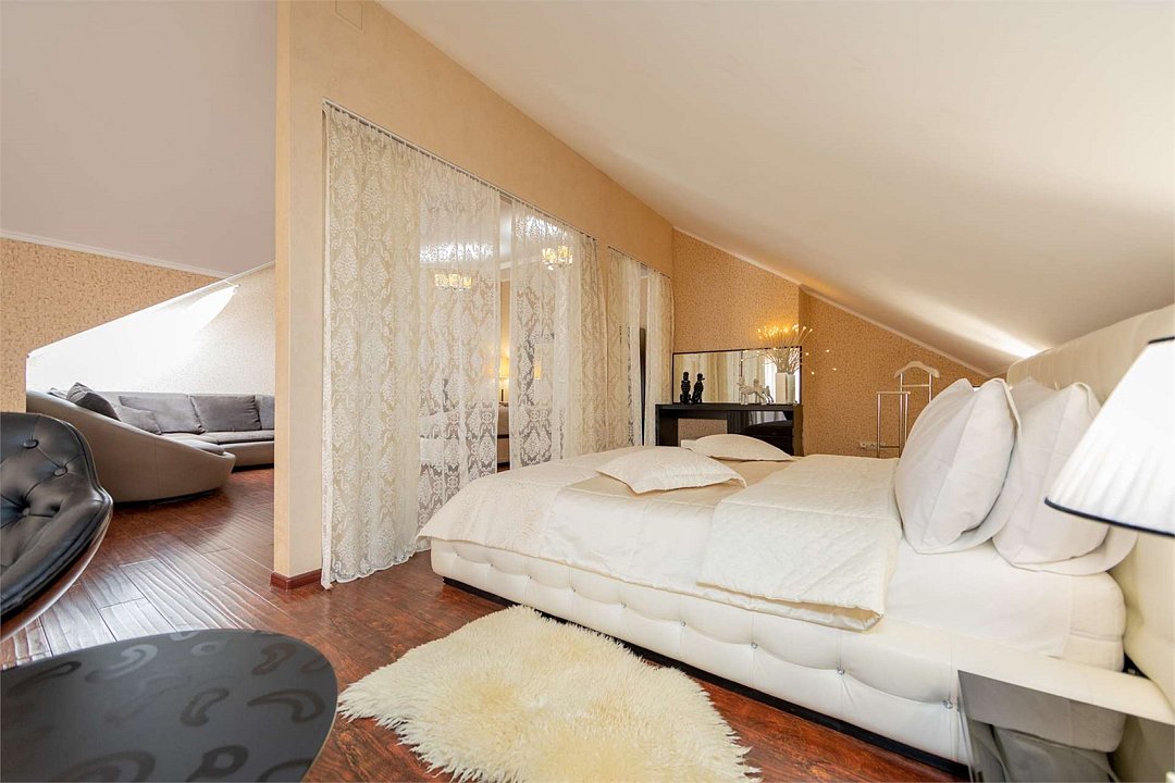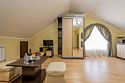 Комплектация и описание номера: Комфортабельный номер с авторским дизайном общей площадью 125 м2. В номере: двуспальная кровать, диваны, кресла, столы, стулья, прикроватные тумбочки, женский будуар и прочая необходимая мебель, мини-кухня. Компактная кухонная зона, предназначенная для мытья фруктов и посуды, но не для приготовления пищи. В качестве дополнительного места служит раскладной диван. По запросу возможно размещение более четырёх человек, в качестве дополнительного спального места предоставляется еврораскладушка. При размещении с маленькими детьми, по запросу, бесплатно устанавливается детская кроватка. Номер в единственном исполнении, расположен на 4 этаже.Услуги и удобства