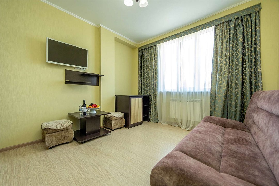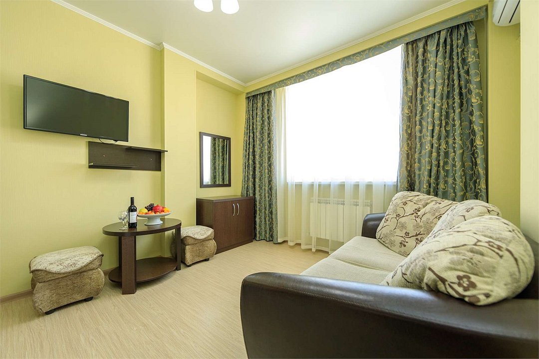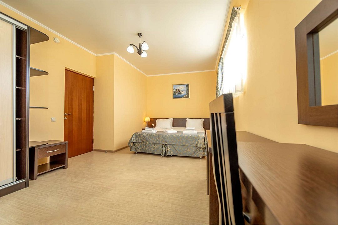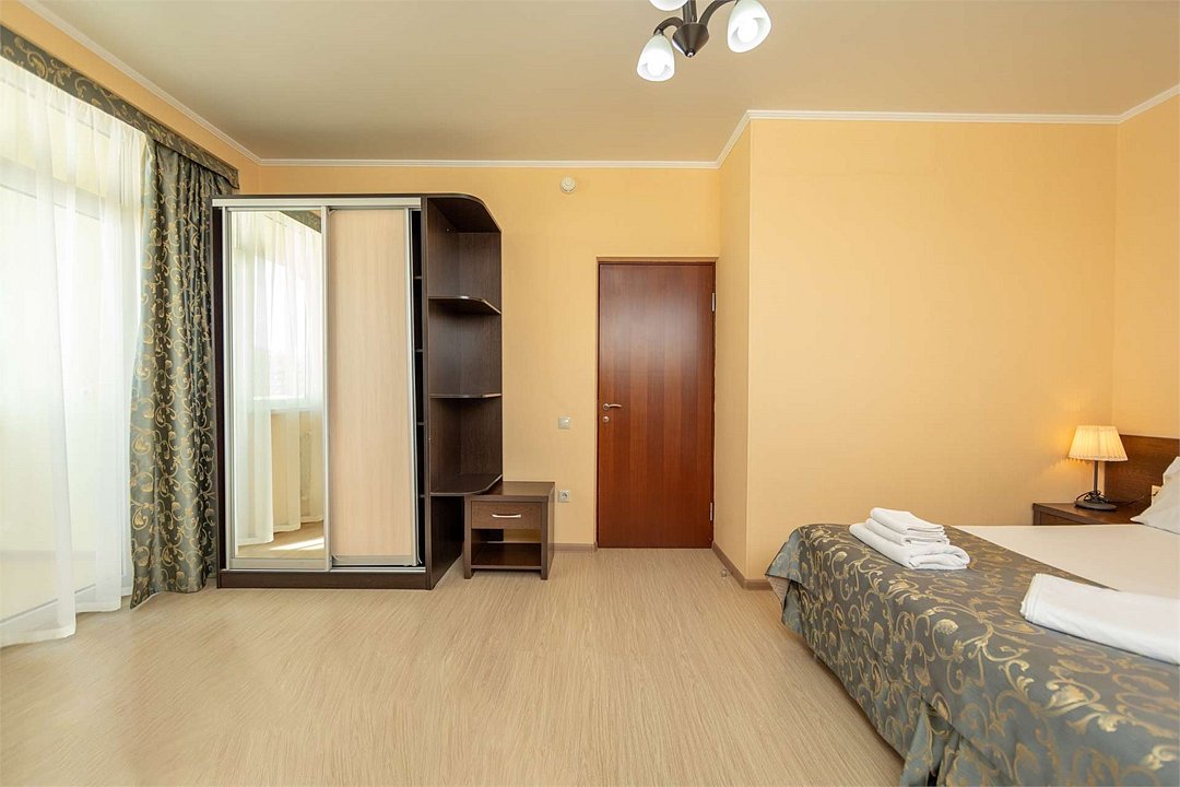 Комплектация и описание номера: Двухкомнатный номер общей площадью 40 м2. В номере: двуспальная кровать, прикроватные тумбочки, двуспальный диван, шкаф, стол, стулья и прочая мебель, мини-кухня. Компактная кухонная зона, предназначенная для мытья фруктов и посуды, но не для приготовления пищи. Возможно размещение на дополнительном месте. Дополнительным местом служит раскладной диван, расположенный во второй комнате. При размещении с маленькими детьми, по запросу, бесплатно устанавливается детская кроватка. Номера расположены на 1 и 3 этаже.Услуги и удобства