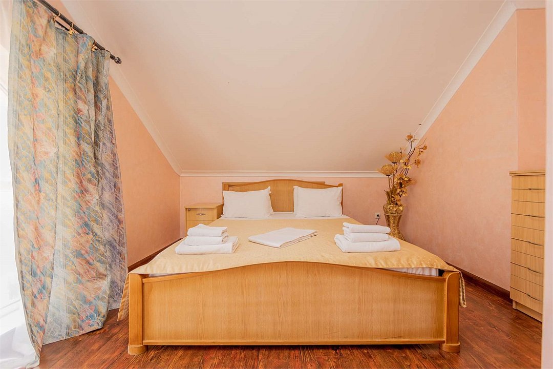 Комплектация и описание номера: Однокомнатный номер общей площадью 16 м2. В номере: двуспальная кровать, прикроватные тумбочки, шкаф, стол, стулья и прочая необходимая мебель. При размещении с маленькими детьми, по запросу гостей, бесплатно устанавливается детская кроватка. Номера расположены на 1 и 2 этажах.Услуги и удобства