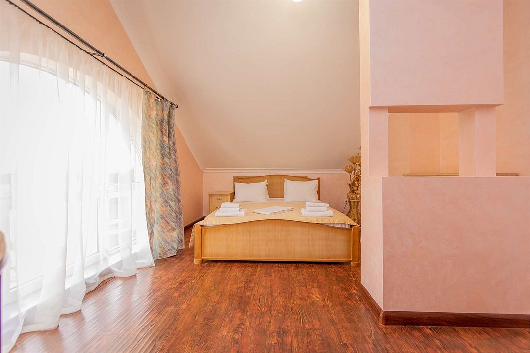 Комплектация и описание номера: Однокомнатный номер общей площадью 25 м2. В номере: двуспальная кровать, раскладной диван или кресло кровать, прикроватные тумбочки, шкаф, стол, стулья и прочая необходимая мебель. Возможно размещение на дополнительном месте. В качестве дополнительного места служит раскладной диван или кресло кровать. При размещении с маленькими детьми, по запросу гостей, бесплатно устанавливается детская кроватка. Номера расположены на 1 и 2 этажах.Услуги и удобства