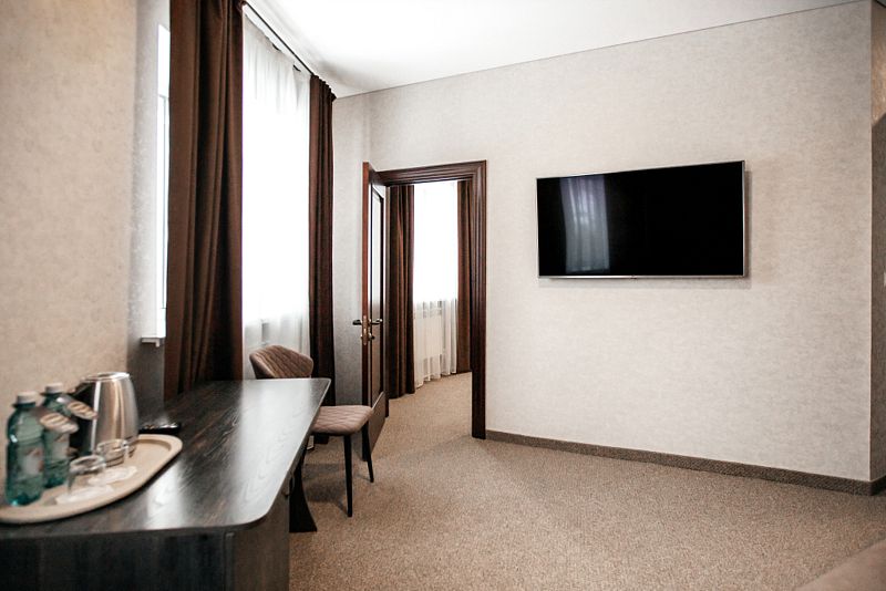 Очень большой по площади номер. С новым ремонтом. Двухкомнатный: просторная гостиная комната и огромная спальня. Позволяет комфортно разместиться как двоим, так и четверым гостям. Номер оборудован всем необходимым. В спальне - одна большая кровать, размера кинг-сайз (180*200). Прикроватные тумбочки, светильники, кресло. Вид из окна на город и на горы.