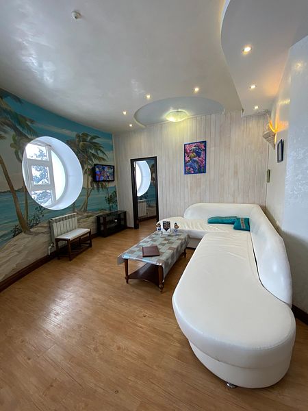 Достаточно просторный номер с новым ремонтом. Двухкомнатный: гостиная комната и спальня. Позволяет комфортно разместиться двоим гостям. Номер оборудован всем необходимым. В спальне - одна большая кровать.