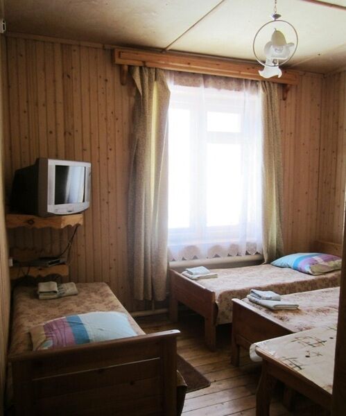 В номере есть двухспальные и односпальные кровати, тумбочки, стулья, шкаф для одежды, спутниковое ТВ, холодильник в холле, душ и туалет - один на 3 номера.