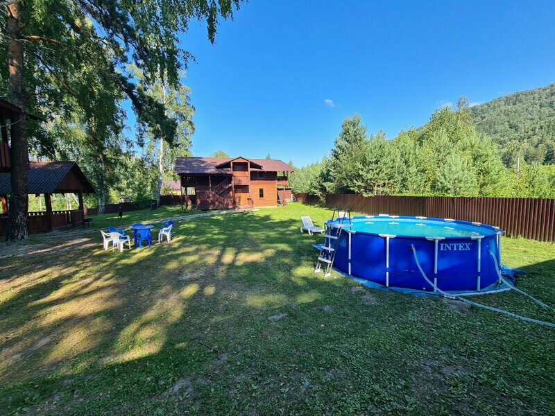 Отдохните на природе! Река Катунь протекает всего в 200 метрах от базы отдыха. А на территории вас ждет бассейн, где вы сможете понежиться в лучах солнца на удобных шезлонгах.