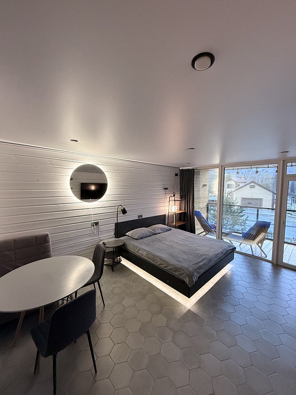 Еще один мелкий недочет - темный глянцевый лак на полу в номерах. Поскольку со мной была собака, а собаки перед входом в номер не привыкли мыть лапы, через 20-30 минут нахождения в номере весь пол был в пыльных следах. что снизило ощущение опрятности номера. В номере на втором этаже не было телевизора, собственники молодые ребята, не учитывают, что иногда возрастные гости могут просто захотеть побыть в номере и им тоже хочется тихих развлечений. Розеток в номере достаточное количество, проблем с восстановлением гаджетов не будет. При этом нет розеток на балконе. Стоимость проживания находится на краю соответствия ожиданиям и сервиса. Необходимо менять баланс в сторону сервиса, оставляя "кост" на прежнем уровне. Рядом нет расположенных магазинов, только в поселке, по улице примерно 600 м. Есть шашлычная в право от выхода - 400 м. Проезд внутри пос. Черемшанка не обозначен никак, только по наитию можно добраться. Нет даже рекламного щита. -
