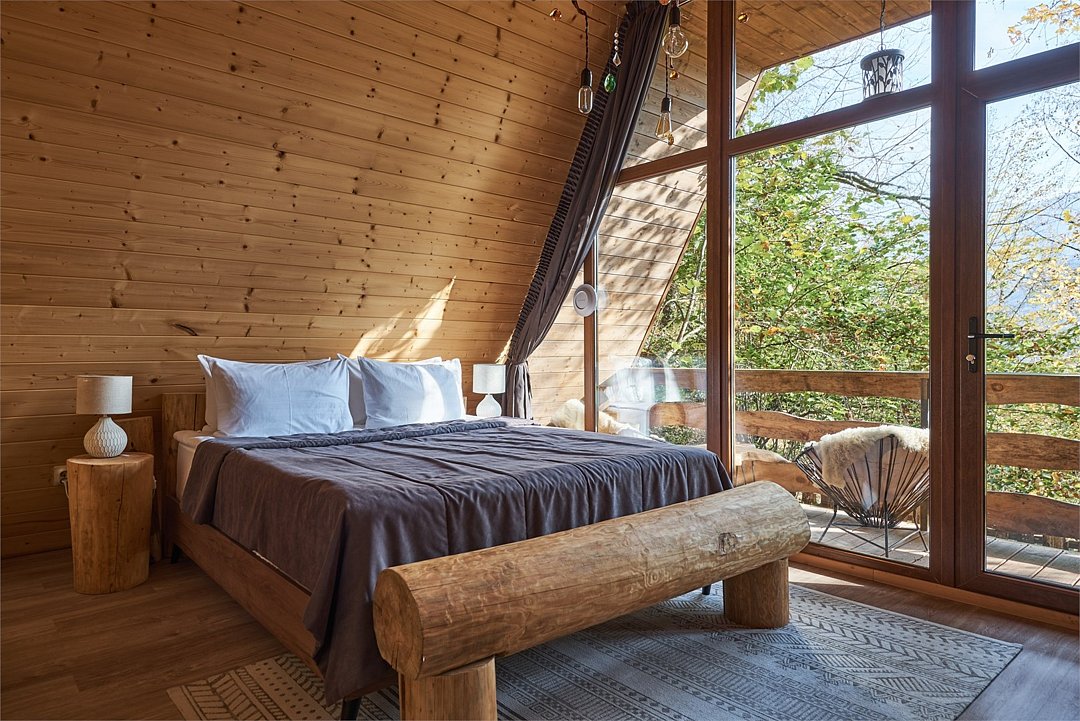 Wi-Fi, кондиционер, светильник, настольные лампы, фен, весы, кофемашина, душевая кабина, водонагреватель, банные принадлежности, халаты, банные полотенца, тапочки, косметические средства, двуспальная кровать, комод, питьевая вода, стаканы, мини-холодильник, вид на горы, вид на лес, пуфик, чайная станция, кофеваркаВ коттедже
