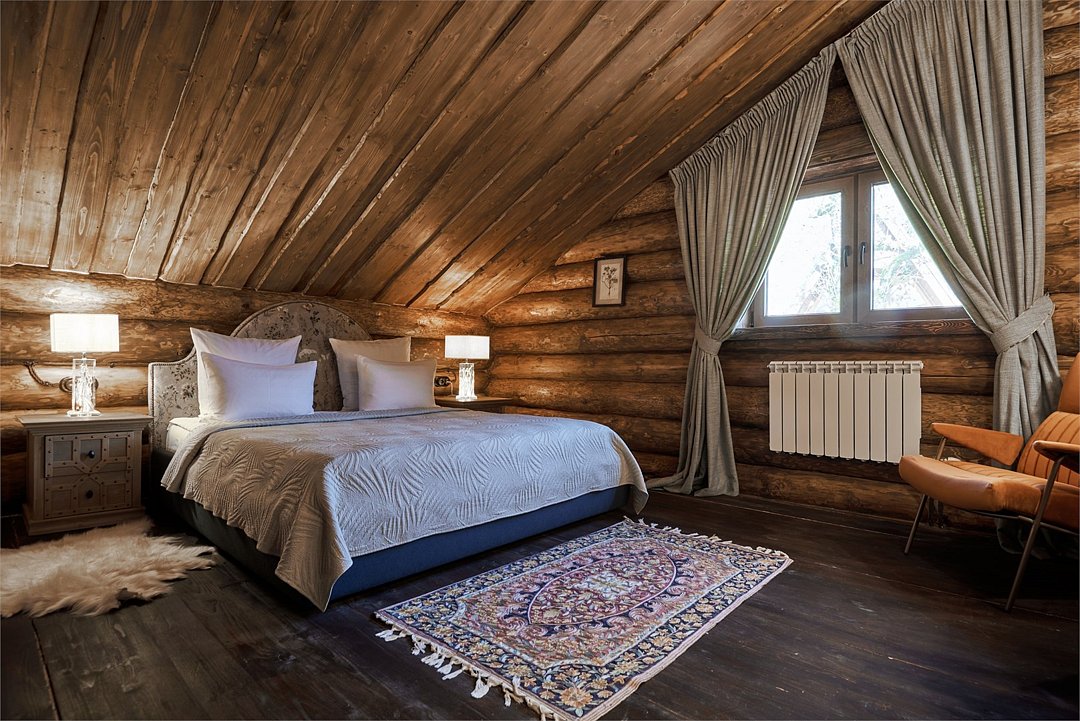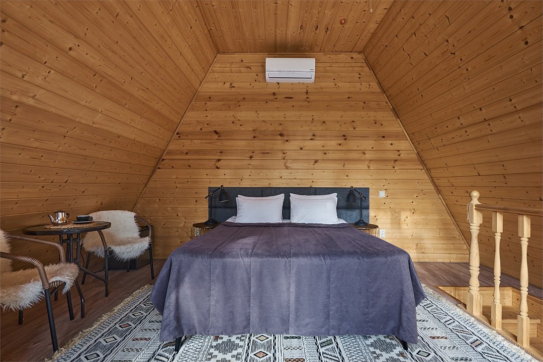 Небольшой дизайнерский однокомнатный номер, расположенный на втором этаже деревянного гостевого дома, излучает уют и комфорт, создавая атмосферу уединения и покоя. Окна номера открывают захватывающий вид на величественные горы и живописный деревенский ландшафт, позволяя насладиться красотой природы в любое время дня. В комнате расположена современная двуспальная кровать размеров 160х200 с качественным матрасом, обеспечивающим идеальный отдых. Премиальное постельное бельё из натуральных тканей добавляет ощущение роскоши и уюта, позволяя вам полностью расслабиться после насыщенного дня. Ванная комната, оборудованная душевой кабиной, предлагает все современные удобства. Здесь же вы найдёте фен и тщательно подобранные косметические принадлежности: шампунь, кондиционер, лосьон, гель для душа и мыло. Для Вашего комфорта в номере есть махровый халат и мягкие тапочки. Однако, в этом живописном убежище есть один нюанс: шумоизоляция деревянного дома дополнит ваше пребывание эхом шагов по коридору, ароматом кофе из гостиной и голосами отдыхающих. Тем не менее, этот недочет не затмевает общего впечатления от пребывания в этом волшебном уголке, где каждое мгновение наполнено красотой и умиротворением. Это идеальное место для восстановления сил и наслаждения красотой окружающего мира.Услуги и удобства