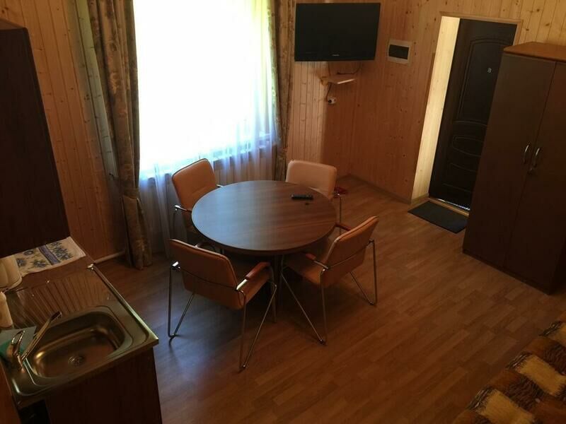 Удобства в шале: Телевизор, Утюг, Гладильные принадлежности, Гостиный уголок, Стиральная машина, Отопление, Отдельный вход, Деревянный/Паркетный пол, Москитная сетка, Шкаф/гардероб, Вешалка для одежды, Раскладная кровать, Диван-кровать, Туалет, Ванная комната, Мини-кухня, Холодильник, Кухня, Обеденный уголок, Электрический чайник, Кухонные принадлежности, Плита, Обеденный стол.