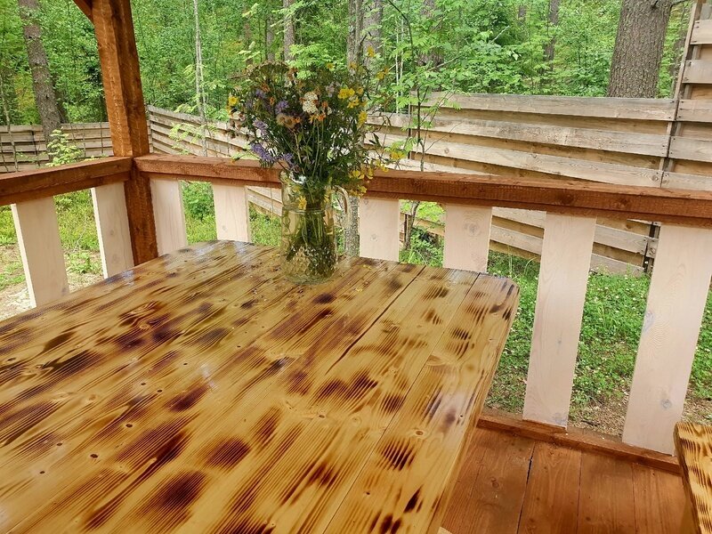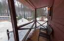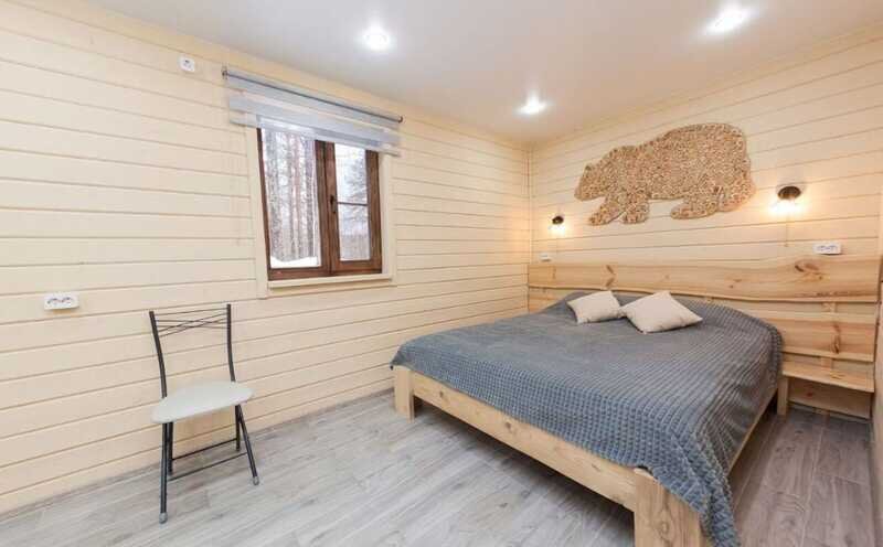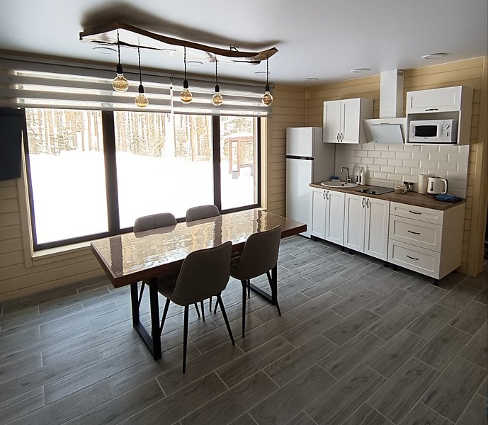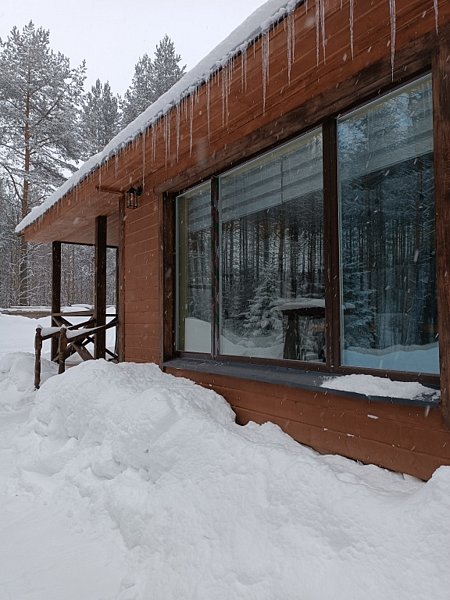 - светлая, просторная комната — студия с большим панорамным окном, с прекрасным видом на сосновый лес;