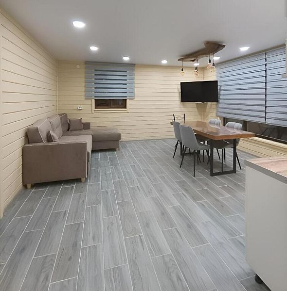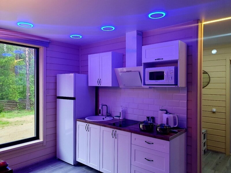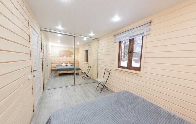 Дом оборудован всей необходимой техникой, тёплыми полами, имеет уютные спальни, душевую со всеми необходимыми принадлежностями, а также просторную и светлую комнату с панорамными окнами, из которой открывается прекрасный вид на прекрасный сосновый лес.